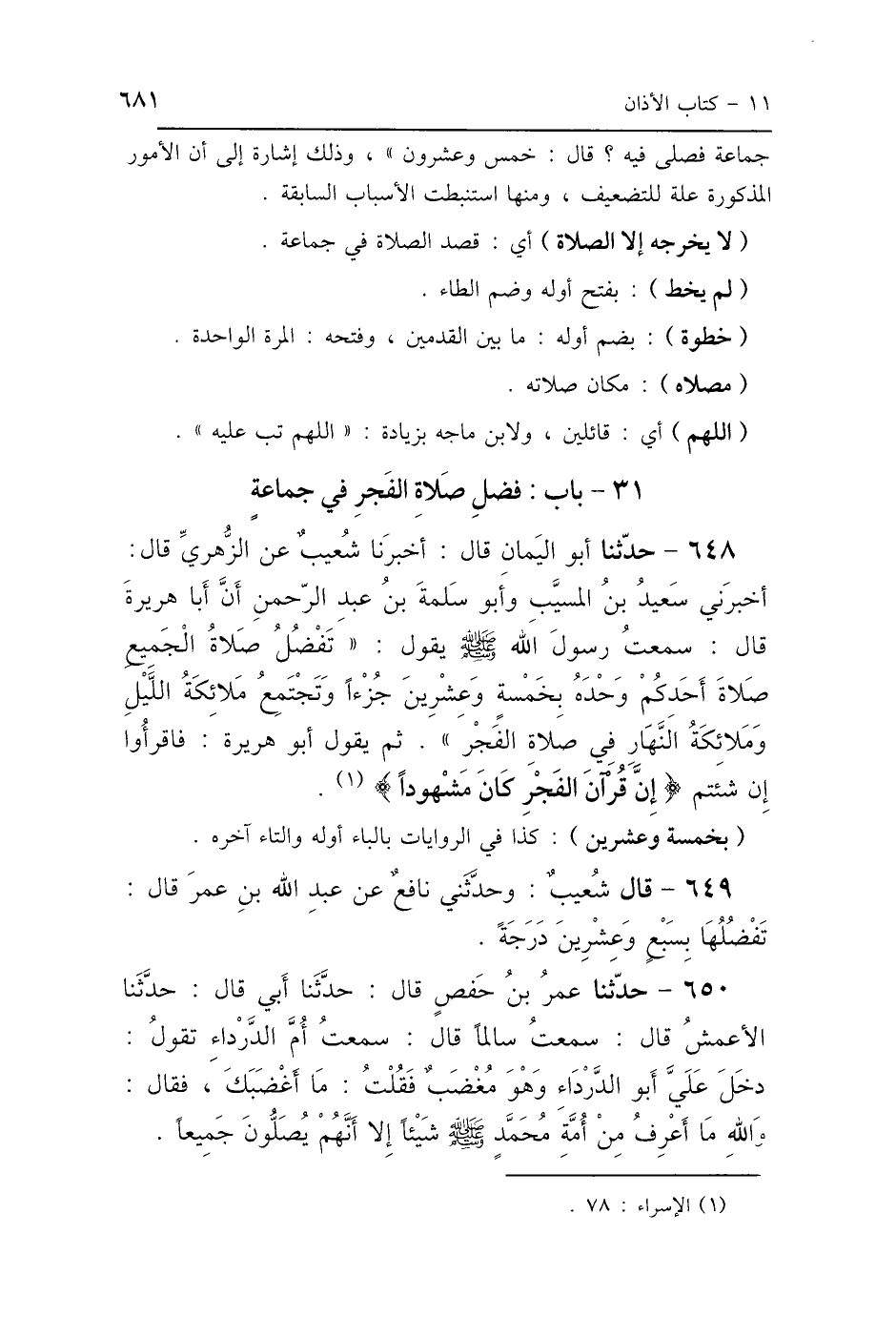 648 - حَدَّثَنَا أَبُو اليَمَانِ، قَالَ: أَخْبَرَنَا شُعَيْبٌ، عَنِ الزُّهْرِيِّ، قَالَ: أَخْبَرَنِي سَعِيدُ بْنُ المُسَيِّبِ، وَأَبُو سَلَمَةَ بْنُ عَبْدِ الرَّحْمَنِ، أَنَّ أَبَا هُرَيْرَةَ، قَالَ: سَمِعْتُ رَسُولَ اللَّهِ صَلَّى اللهُ عَلَيْهِ وَسَلَّمَ يَقُولُ: «تَفْضُلُ صَلاَةُ الجَمِيعِ صَلاَةَ أَحَدِكُمْ وَحْدَهُ، بِخَمْسٍ وَعِشْرِينَ جُزْءًا، وَتَجْتَمِعُ مَلاَئِكَةُ اللَّيْلِ وَمَلاَئِكَةُ النَّهَارِ فِي صَلاَةِ الفَجْرِ» ثُمَّ يَقُولُ أَبُو هُرَيْرَةَ: فَاقْرَءُوا إِنْ شِئْتُمْ: {إِنَّ قُرْآنَ الفَجْرِ كَانَ مَشْهُودًا} [الإسراء: 78].