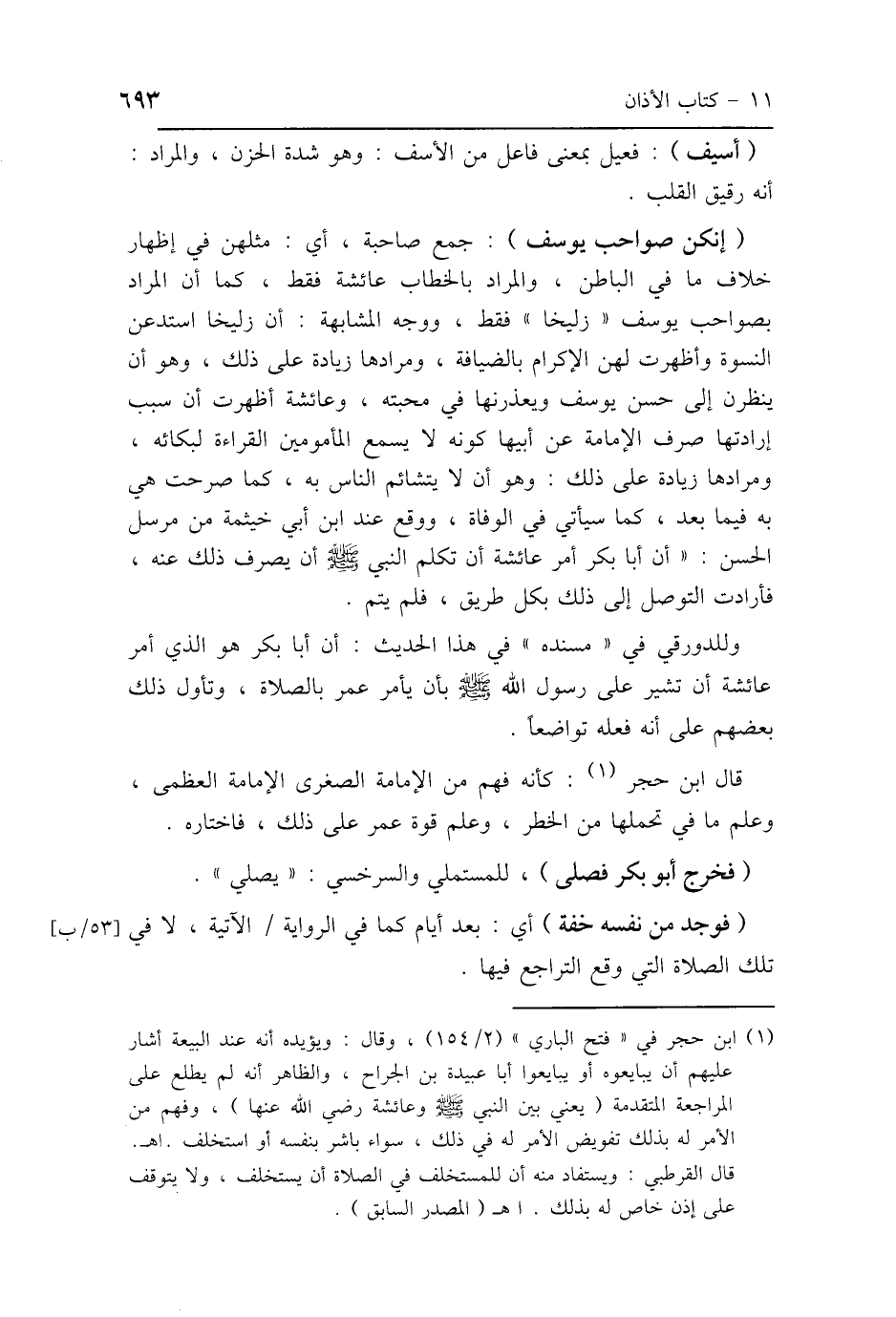(إنكن صواحب يوسف): جمع صاحبة، أي: مثلهن في إظهار خلاف ما في الباطن، والمراد بالخطاب عائشة فقط، كما أن الراد بصواحب يوسف "زليخا" فقط، ووجه المشابهة: أن زليخا استدعن النسوة وأظهرت لهن الإكرام بالضيافة، ومرادها زيادة على ذلك، وهو أن ينظرن إلى حسن يوسف ويعذرنها في محبته، وعائشة أظهرت أن سبب إرادتها صرف الإمامة عن أبيها كونه لا يسمع المأمومين القراءة لبكائه، ومرادها زيادة على ذلك: وهو أن لا يتشائم الناس به، كما صرحت هي به فيما بعد، كما سيأتي في الوفاة، ووقع عند ابن أبي خيثمة من مرسل الحسن: "أن أبا بكر أمر عائشة أن تكلم النبي - صلى الله عليه وسلم - أن يصرف ذلك عنه، فأرادت التوصل إلى ذلك بكل طريق، فلم يتم.