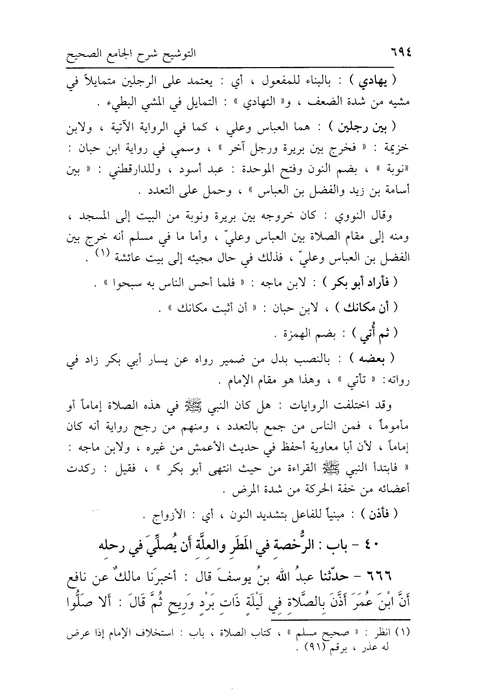 (بين رجلين): هما العباس وعلي، كما في الرواية الآتية، ولابن خزيمة: "فخرج بين بريرة ورجل آخر"، وسمي في رواية ابن حبان: "نوبة"، بضم النون وفتح الموحدة: عبد أسود، وللدارقطني: "بين أسامة بن زيد والفضل بن العباس"، وحمل على التعدد.