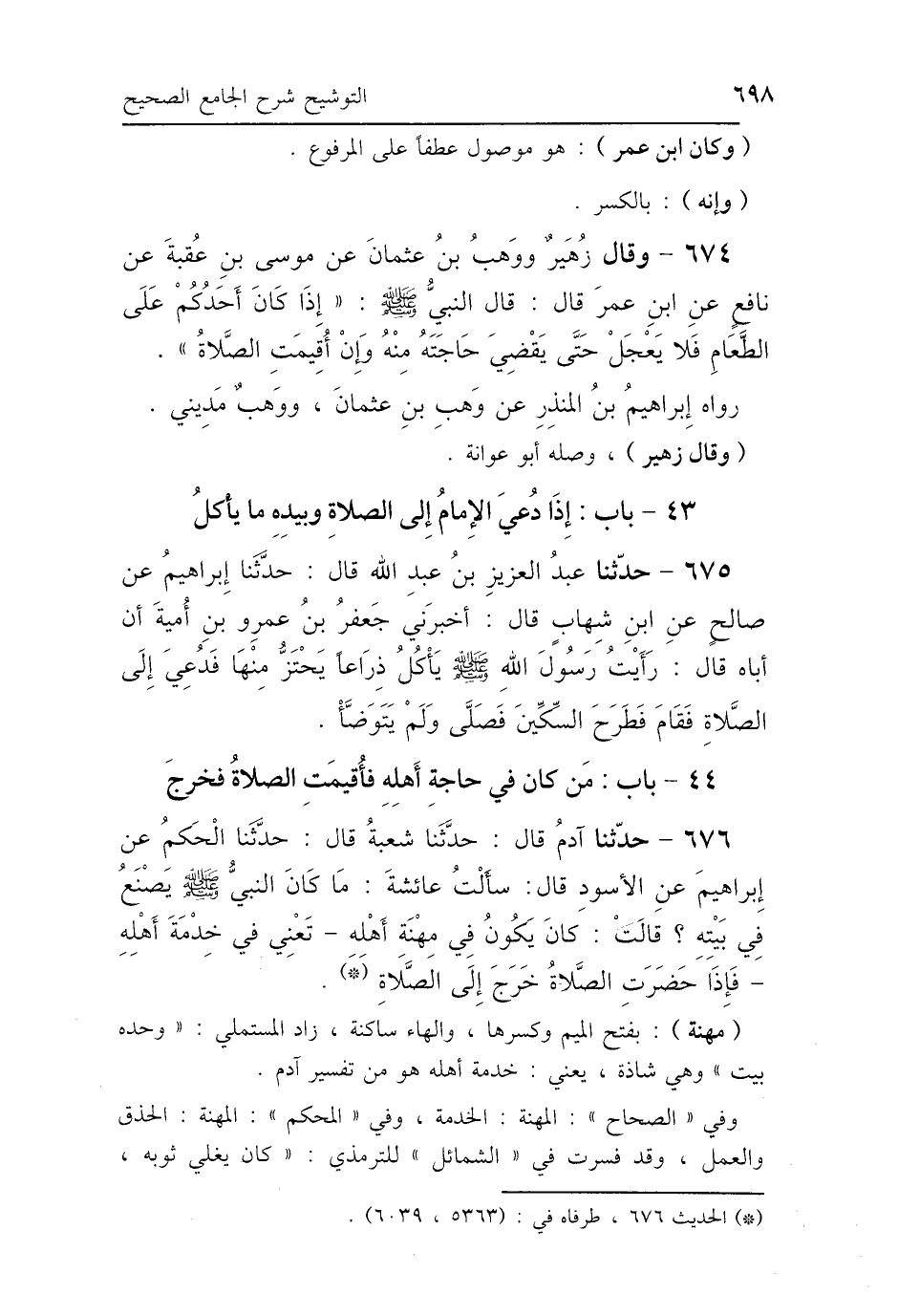 674 - وَقَالَ زُهَيْرٌ، وَوَهْبُ بْنُ عُثْمَانَ، عَنْ مُوسَى بْنِ عُقْبَةَ، عَنْ نَافِعٍ، عَنْ ابْنِ عُمَرَ، قَالَ: قَالَ النَّبِيُّ صَلَّى اللهُ عَلَيْهِ وَسَلَّمَ: «إِذَا كَانَ أَحَدُكُمْ عَلَى الطَّعَامِ، فَلاَ يَعْجَلْ حَتَّى يَقْضِيَ حَاجَتَهُ مِنْهُ، وَإِنْ أُقِيمَتِ الصَّلاَةُ»، رَوَاهُ إِبْرَاهِيمُ بْنُ المُنْذِرِ، عَنْ وَهْبِ بْنِ عُثْمَانَ «وَوَهْبٌ مَدِينِيٌّ».
