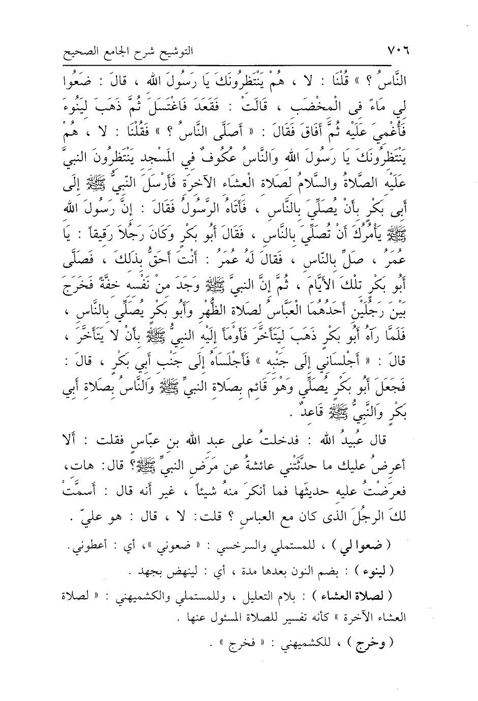 النَّاسُ؟» قُلْنَا: لاَ، هُمْ يَنْتَظِرُونَكَ يَا رَسُولَ اللَّهِ، فَقَالَ: «ضَعُوا لِي مَاءً فِي المِخْضَبِ»، فَقَعَدَ، فَاغْتَسَلَ، ثُمَّ ذَهَبَ لِيَنُوءَ فَأُغْمِيَ عَلَيْهِ، ثُمَّ أَفَاقَ فَقَالَ: «أَصَلَّى النَّاسُ؟» فَقُلْنَا: لاَ، هُمْ يَنْتَظِرُونَكَ يَا رَسُولَ اللَّهِ، وَالنَّاسُ عُكُوفٌ فِي المَسْجِدِ، يَنْتَظِرُونَ النَّبِيَّ عَلَيْهِ السَّلاَمُ لِصَلاَةِ العِشَاءِ الآخِرَةِ، فَأَرْسَلَ النَّبِيُّ صَلَّى اللهُ عَلَيْهِ وَسَلَّمَ إِلَى أَبِي بَكْرٍ بِأَنْ يُصَلِّيَ بِالنَّاسِ، فَأَتَاهُ الرَّسُولُ فَقَالَ: إِنَّ رَسُولَ اللَّهِ صَلَّى اللهُ عَلَيْهِ وَسَلَّمَ يَأْمُرُكَ أَنْ تُصَلِّيَ بِالنَّاسِ، فَقَالَ أَبُو بَكْرٍ - وَكَانَ رَجُلًا رَقِيقًا -: يَا عُمَرُ صَلِّ بِالنَّاسِ، فَقَالَ لَهُ عُمَرُ: أَنْتَ أَحَقُّ بِذَلِكَ، فَصَلَّى أَبُو بَكْرٍ تِلْكَ الأَيَّامَ، ثُمَّ إِنَّ النَّبِيَّ صَلَّى اللهُ عَلَيْهِ وَسَلَّمَ وَجَدَ مِنْ نَفْسِهِ خِفَّةً، فَخَرَجَ بَيْنَ رَجُلَيْنِ أَحَدُهُمَا العَبَّاسُ لِصَلاَةِ الظُّهْرِ وَأَبُو بَكْرٍ يُصَلِّي بِالنَّاسِ، فَلَمَّا رَآهُ أَبُو بَكْرٍ ذَهَبَ لِيَتَأَخَّرَ، فَأَوْمَأَ إِلَيْهِ النَّبِيُّ صَلَّى اللهُ عَلَيْهِ وَسَلَّمَ بِأَنْ لاَ يَتَأَخَّرَ، قَالَ: أَجْلِسَانِي إِلَى جَنْبِهِ، فَأَجْلَسَاهُ إِلَى جَنْبِ أَبِي بَكْرٍ، قَالَ: فَجَعَلَ أَبُو بَكْرٍ يُصَلِّي وَهُوَ يَأْتَمُّ بِصَلاَةِ النَّبِيِّ صَلَّى اللهُ عَلَيْهِ وَسَلَّمَ، وَالنَّاسُ بِصَلاَةِ أَبِي بَكْرٍ، وَالنَّبِيُّ صَلَّى اللهُ عَلَيْهِ وَسَلَّمَ قَاعِدٌ، قَالَ عُبَيْدُ اللَّهِ: فَدَخَلْتُ عَلَى عَبْدِ اللَّهِ بْنِ عَبَّاسٍ فَقُلْتُ لَهُ: أَلاَ أَعْرِضُ عَلَيْكَ مَا حَدَّثَتْنِي عَائِشَةُ عَنْ مَرَضِ النَّبِيِّ صَلَّى اللهُ عَلَيْهِ وَسَلَّمَ، قَالَ: هَاتِ، فَعَرَضْتُ عَلَيْهِ حَدِيثَهَا، فَمَا أَنْكَرَ مِنْهُ شَيْئًا غَيْرَ أَنَّهُ قَالَ: أَسَمَّتْ لَكَ الرَّجُلَ الَّذِي كَانَ مَعَ العَبَّاسِ قُلْتُ: لاَ، قَالَ: هُوَ عَلِيُّ بْنُ أَبِي طَالِبٍ رَضِيَ اللَّهُ عَنْهُ.