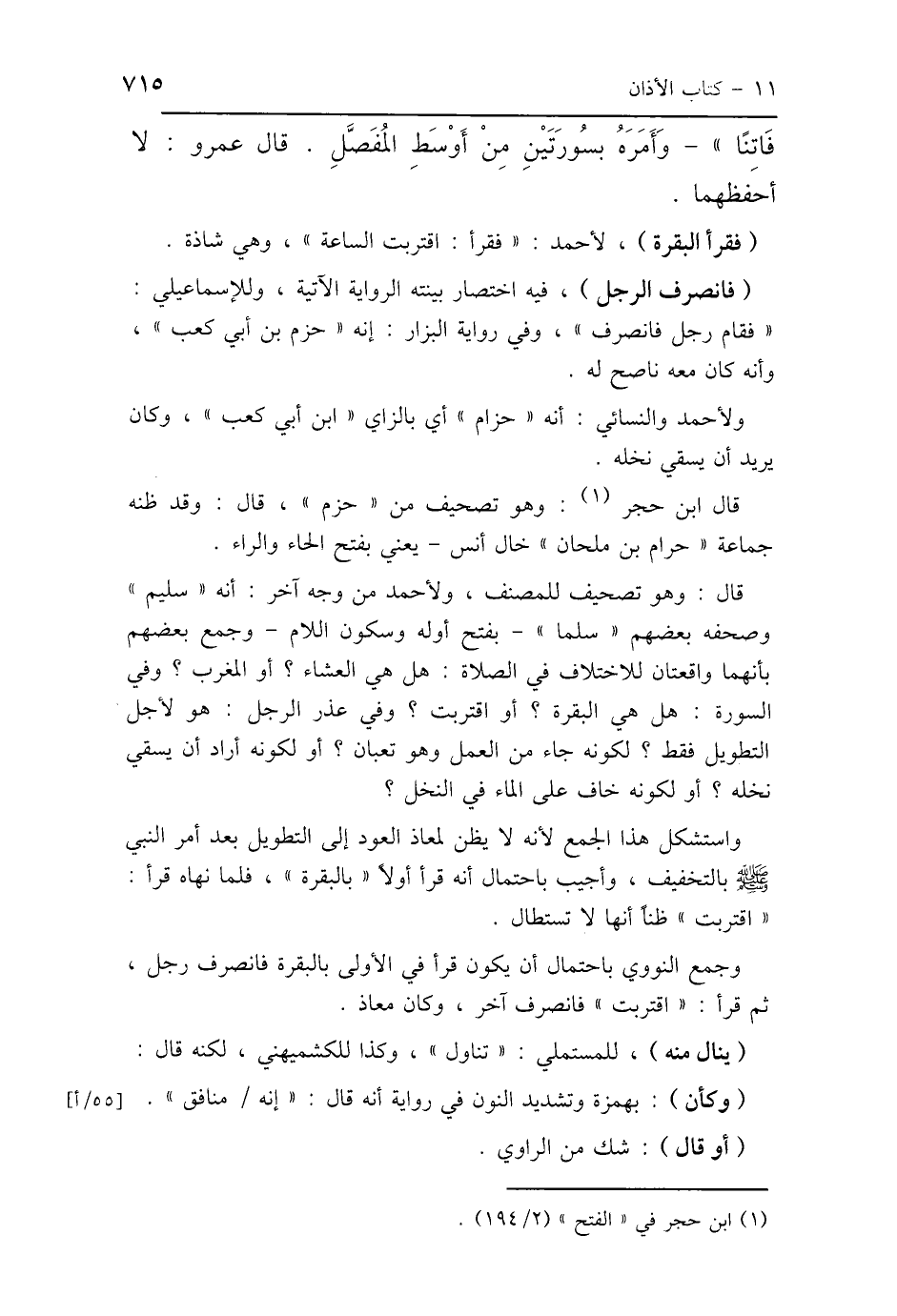 قال: وهو تصحيف للمصنف، ولأحمد من وجه آخر: أنه "سليم" وصحفه بعضهم "سلما" -بفتح أوله وسكون اللام- وجمع بعضهم بأنهما واقعتان للاختلاف في الصلاة: هل هي العشاء؟ أو المغرب؟ وفي السورة: هل هي البقرة؟ أو اقتربت؟ وفي عذر الرجل: هو لأجل التطويل فقط؟ لكونه جاء من العمل وهو تعبان؟ أو لكونه أراد أن يسقي نخله؟ أو لكونه خاف على الماء في النخل؟