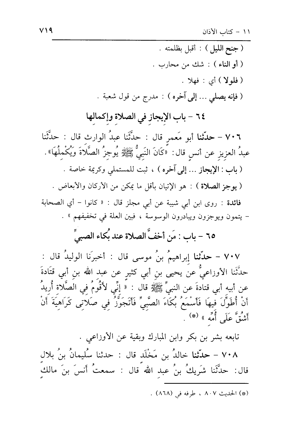 707 - حَدَّثَنَا إِبْرَاهِيمُ بْنُ مُوسَى، قَالَ: أَخْبَرَنَا الوَلِيدُ بْنُ مُسْلِمٍ، قَالَ: حَدَّثَنَا الأَوْزَاعِيُّ، عَنْ يَحْيَى بْنِ أَبِي كَثِيرٍ، عَنْ عَبْدِ اللَّهِ بْنِ أَبِي قَتَادَةَ، عَنْ أَبِيهِ أَبِي قَتَادَةَ، عَنِ النَّبِيِّ صَلَّى اللهُ عَلَيْهِ وَسَلَّمَ قَالَ: «إِنِّي لَأَقُومُ فِي الصَّلاَةِ أُرِيدُ أَنْ أُطَوِّلَ فِيهَا، فَأَسْمَعُ بُكَاءَ الصَّبِيِّ، فَأَتَجَوَّزُ فِي صَلاَتِي كَرَاهِيَةَ أَنْ أَشُقَّ عَلَى أُمِّهِ» تَابَعَهُ بِشْرُ بْنُ بَكْرٍ، وَابْنُ المُبَارَكِ، وَبَقِيَّةُ، عَنِ الأَوْزَاعِيِّ.