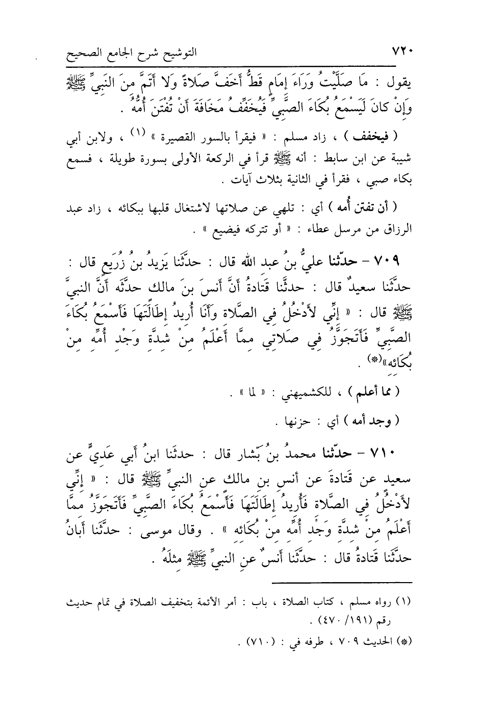 يَقُولُ: «مَا صَلَّيْتُ وَرَاءَ إِمَامٍ قَطُّ أَخَفَّ صَلاَةً، وَلاَ أَتَمَّ مِنَ النَّبِيِّ صَلَّى اللهُ عَلَيْهِ وَسَلَّمَ وَإِنْ كَانَ لَيَسْمَعُ بُكَاءَ الصَّبِيِّ، فَيُخَفِّفُ مَخَافَةَ أَنْ تُفْتَنَ أُمُّهُ».