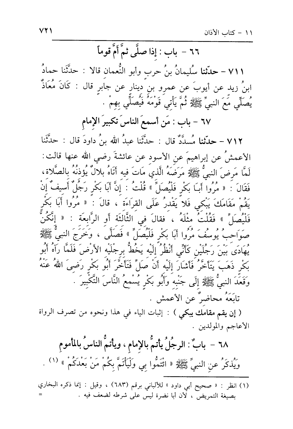 712 - حَدَّثَنَا مُسَدَّدٌ، قَالَ: حَدَّثَنَا عَبْدُ اللَّهِ بْنُ دَاوُدَ، قَالَ: حَدَّثَنَا الأَعْمَشُ، عَنْ إِبْرَاهِيمَ، عَنِ الأَسْوَدِ، عَنْ عَائِشَةَ رَضِيَ اللَّهُ عَنْهَا، قَالَتْ: لَمَّا مَرِضَ النَّبِيُّ صَلَّى اللهُ عَلَيْهِ وَسَلَّمَ مَرَضَهُ الَّذِي مَاتَ فِيهِ أَتَاهُ بِلاَلٌ يُوذِنُهُ بِالصَّلاَةِ، فَقَالَ: «مُرُوا أَبَا بَكْرٍ فَلْيُصَلِّ»، قُلْتُ: إِنَّ أَبَا بَكْرٍ رَجُلٌ أَسِيفٌ إِنْ يَقُمْ مَقَامَكَ يَبْكِي، فَلاَ يَقْدِرُ عَلَى القِرَاءَةِ، فَقَالَ: «مُرُوا أَبَا بَكْرٍ فَلْيُصَلِّ»، فَقُلْتُ: مِثْلَهُ، فَقَالَ فِي الثَّالِثَةِ أَوِ الرَّابِعَةِ: «إِنَّكُنَّ صَوَاحِبُ يُوسُفَ، مُرُوا أَبَا بَكْرٍ فَلْيُصَلِّ»، فَصَلَّى وَخَرَجَ النَّبِيُّ صَلَّى اللهُ عَلَيْهِ وَسَلَّمَ يُهَادَى بَيْنَ رَجُلَيْنِ كَأَنِّي أَنْظُرُ إِلَيْهِ يَخُطُّ بِرِجْلَيْهِ الأَرْضَ، فَلَمَّا رَآهُ أَبُو بَكْرٍ ذَهَبَ يَتَأَخَّرُ، فَأَشَارَ إِلَيْهِ أَنْ صَلِّ، فَتَأَخَّرَ أَبُو بَكْرٍ رَضِيَ اللَّهُ عَنْهُ، وَقَعَدَ النَّبِيُّ صَلَّى اللهُ عَلَيْهِ وَسَلَّمَ إِلَى جَنْبِهِ، وَأَبُو بَكْرٍ يُسْمِعُ النَّاسَ التَّكْبِيرَ تَابَعَهُ مُحَاضِرٌ، عَنِ الأَعْمَشِ.