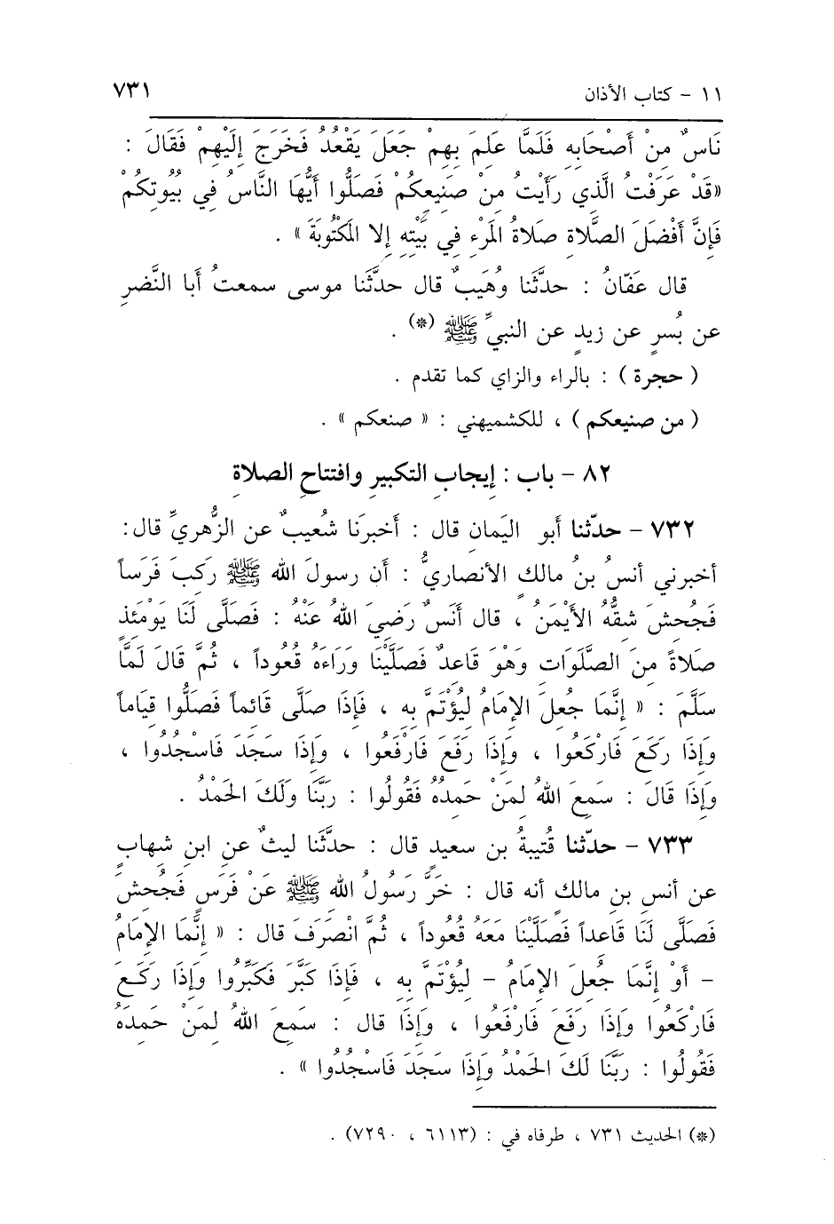 732 - حَدَّثَنَا أَبُو اليَمَانِ، قَالَ: أَخْبَرَنَا شُعَيْبٌ، عَنِ الزُّهْرِيِّ، قَالَ: أَخْبَرَنِي أَنَسُ بْنُ مَالِكٍ الأَنْصَارِيُّ: أَنَّ رَسُولَ اللَّهِ صَلَّى اللهُ عَلَيْهِ وَسَلَّمَ رَكِبَ فَرَسًا فَجُحِشَ شِقُّهُ الأَيْمَنُ - قَالَ أَنَسٌ رَضِيَ اللَّهُ عَنْهُ - فَصَلَّى لَنَا يَوْمَئِذٍ صَلاَةً مِنَ الصَّلَوَاتِ وَهُوَ قَاعِدٌ، فَصَلَّيْنَا وَرَاءَهُ قُعُودًا، ثُمَّ قَالَ لَمَّا سَلَّمَ: " إِنَّمَا جُعِلَ الإِمَامُ لِيُؤْتَمَّ بِهِ، فَإِذَا صَلَّى قَائِمًا فَصَلُّوا قِيَامًا، وَإِذَا رَكَعَ فَارْكَعُوا، وَإِذَا رَفَعَ فَارْفَعُوا، وَإِذَا سَجَدَ فَاسْجُدُوا، وَإِذَا قَالَ: سَمِعَ اللَّهُ لِمَنْ حَمِدَهُ، فَقُولُوا: رَبَّنَا وَلَكَ الحَمْدُ".