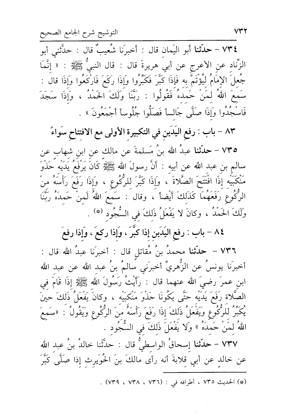 735 - حَدَّثَنَا عَبْدُ اللَّهِ بْنُ مَسْلَمَةَ، عَنْ مَالِكٍ، عَنِ ابْنِ شِهَابٍ، عَنْ سَالِمِ بْنِ عَبْدِ اللَّهِ، عَنْ أَبِيهِ: " أَنَّ رَسُولَ اللَّهِ صَلَّى اللهُ عَلَيْهِ وَسَلَّمَ كَانَ يَرْفَعُ يَدَيْهِ حَذْوَ مَنْكِبَيْهِ إِذَا افْتَتَحَ الصَّلاَةَ، وَإِذَا كَبَّرَ لِلرُّكُوعِ، وَإِذَا رَفَعَ رَأْسَهُ مِنَ الرُّكُوعِ، رَفَعَهُمَا كَذَلِكَ أَيْضًا، وَقَالَ: سَمِعَ اللَّهُ لِمَنْ حَمِدَهُ، رَبَّنَا وَلَكَ الحَمْدُ، وَكَانَ لاَ يَفْعَلُ ذَلِكَ فِي السُّجُودِ".