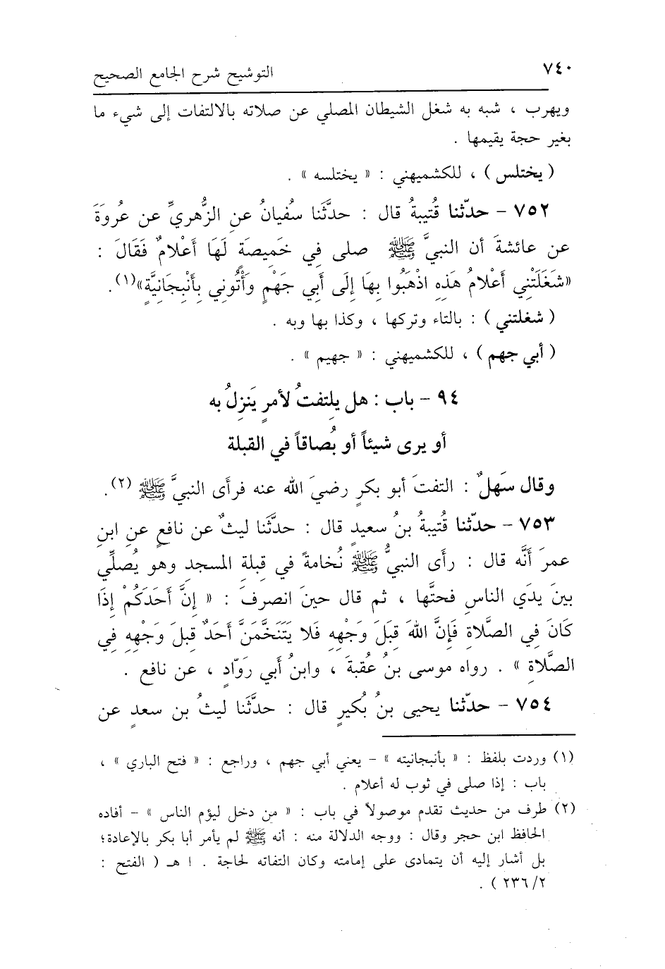 752 - حَدَّثَنَا قُتَيْبَةُ، قَالَ: حَدَّثَنَا سُفْيَانُ، عَنِ الزُّهْرِيِّ، عَنْ عُرْوَةَ، عَنْ عَائِشَةَ: أَنَّ النَّبِيَّ صَلَّى اللهُ عَلَيْهِ وَسَلَّمَ صَلَّى فِي خَمِيصَةٍ لَهَا أَعْلاَمٌ، فَقَالَ: «شَغَلَتْنِي أَعْلاَمُ هَذِهِ، اذْهَبُوا بِهَا إِلَى أَبِي جَهْمٍ وَأْتُونِي بِأَنْبِجَانِيَّةٍ».