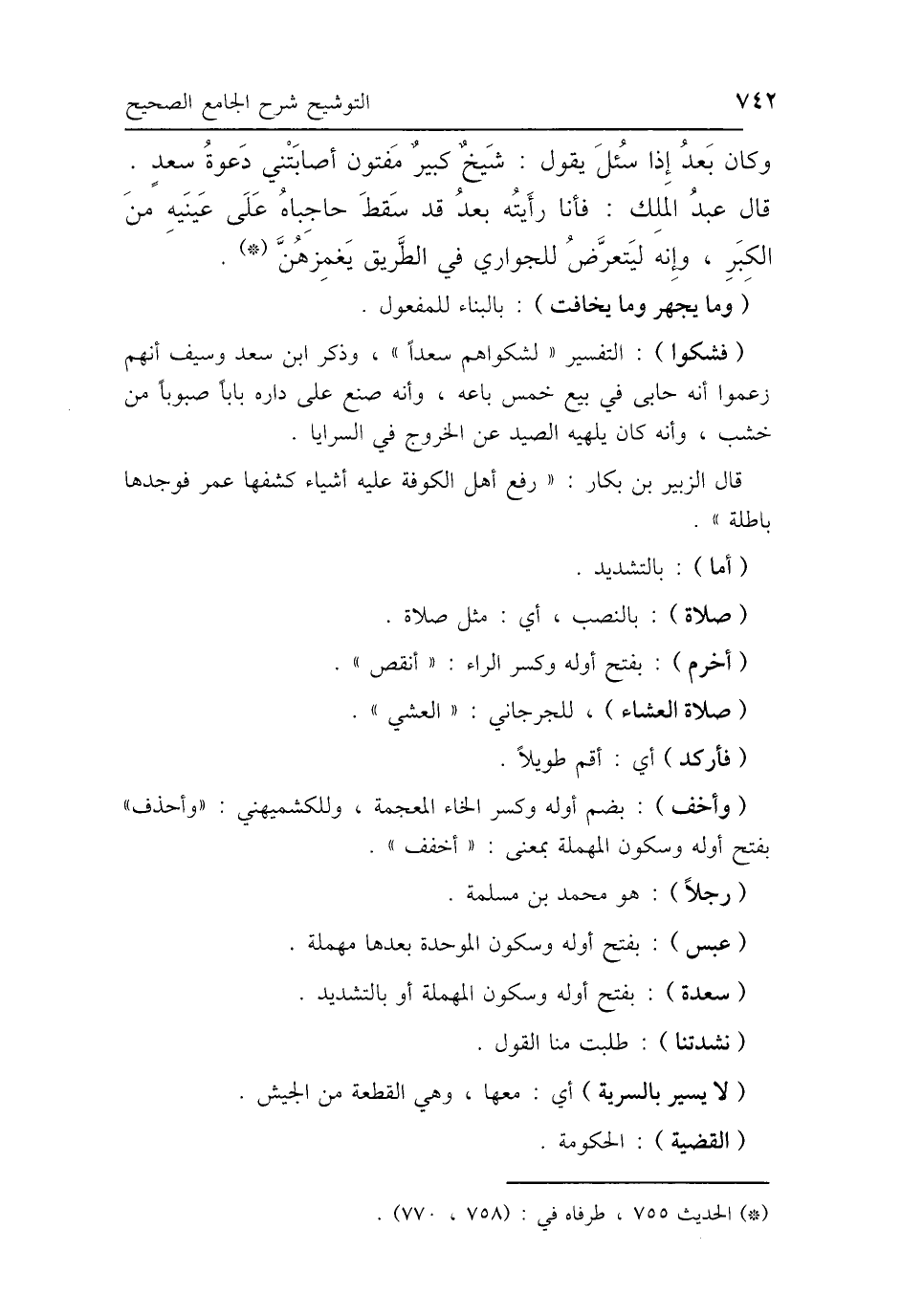 (فشكوا): التفسير "لشكواهم سعدًا"، وذكر ابن سعد وسيف أنهم زعموا أنه حابى في بيع خمس باعه، وأنه صنع على داره بابًا صبوبًا من خشب، وأنه كان يلهيه الصيد عن الخروج في السرايا.
