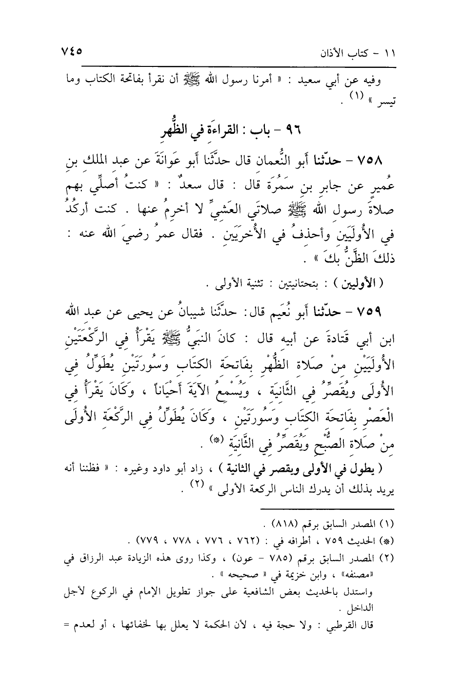 759 - حَدَّثَنَا أَبُو نُعَيْمٍ، قَالَ: حَدَّثَنَا شَيْبَانُ، عَنْ يَحْيَى، عَنْ عَبْدِ اللَّهِ بْنِ أَبِي قَتَادَةَ، عَنْ أَبِيهِ، قَالَ: «كَانَ النَّبِيُّ صَلَّى اللهُ عَلَيْهِ وَسَلَّمَ يَقْرَأُ فِي الرَّكْعَتَيْنِ الأُولَيَيْنِ مِنْ صَلاَةِ الظُّهْرِ بِفَاتِحَةِ الكِتَابِ، وَسُورَتَيْنِ يُطَوِّلُ فِي الأُولَى، وَيُقَصِّرُ فِي الثَّانِيَةِ وَيُسْمِعُ الآيَةَ أَحْيَانًا، وَكَانَ يَقْرَأُ فِي العَصْرِ بِفَاتِحَةِ الكِتَابِ وَسُورَتَيْنِ، وَكَانَ يُطَوِّلُ فِي الأُولَى، وَكَانَ يُطَوِّلُ فِي الرَّكْعَةِ الأُولَى مِنْ صَلاَةِ الصُّبْحِ، وَيُقَصِّرُ فِي الثَّانِيَةِ».
