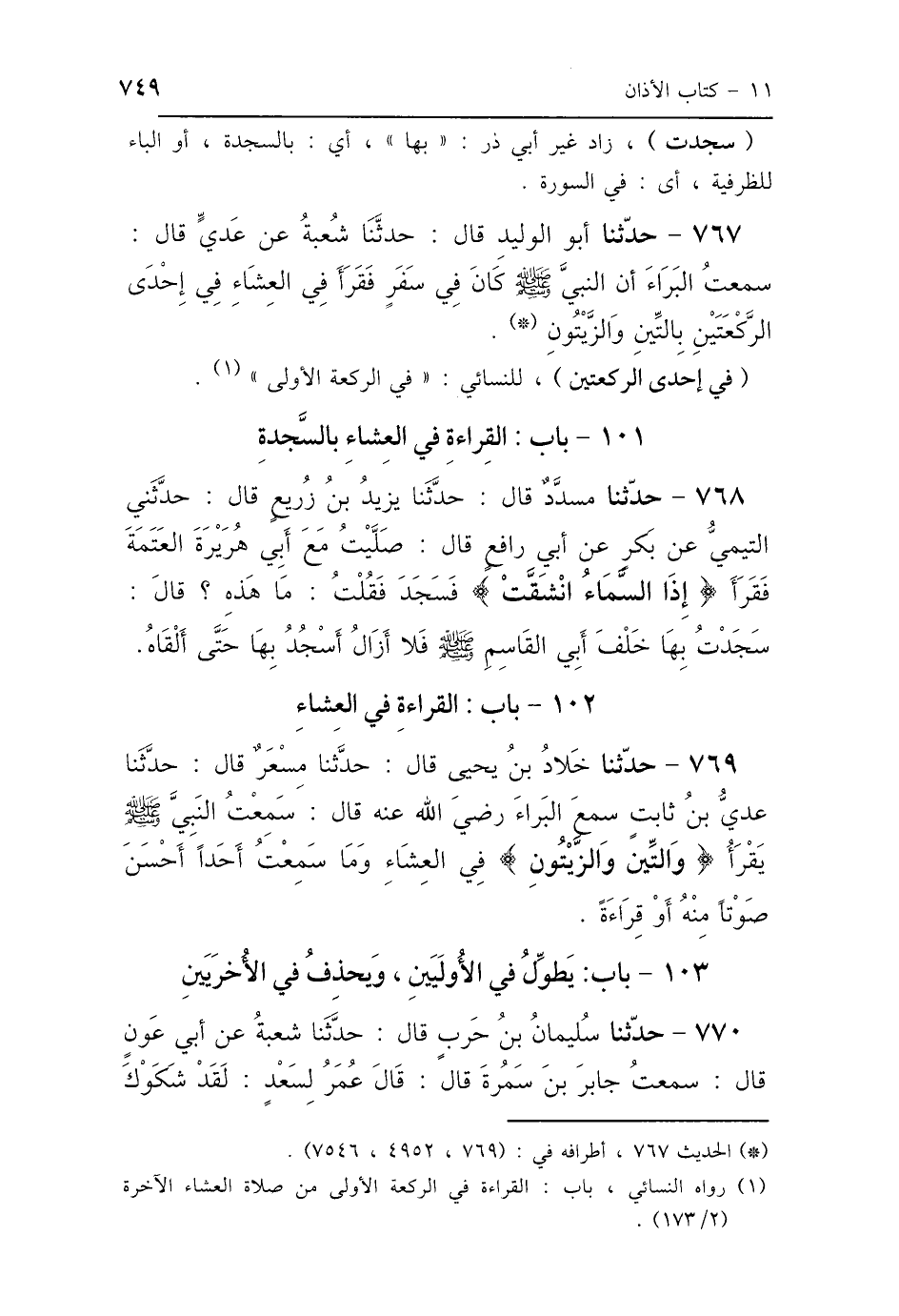 769 - حَدَّثَنَا خَلَّادُ بْنُ يَحْيَى، قَالَ: حَدَّثَنَا مِسْعَرٌ، قَالَ: حَدَّثَنَا عَدِيُّ بْنُ ثَابِتٍ، سَمِعَ البَرَاءَ رَضِيَ اللَّهُ عَنْهُ، قَالَ: سَمِعْتُ النَّبِيَّ صَلَّى اللهُ عَلَيْهِ وَسَلَّمَ " يَقْرَأُ: وَالتِّينِ وَالزَّيْتُونِ فِي العِشَاءِ، وَمَا سَمِعْتُ أَحَدًا أَحْسَنَ صَوْتًا مِنْهُ أَوْ قِرَاءَةً".
