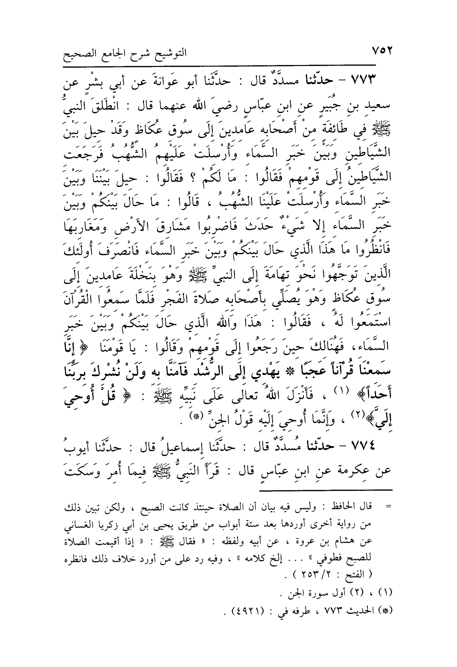 773 - حَدَّثَنَا مُسَدَّدٌ، قَالَ: حَدَّثَنَا أَبُو عَوَانَةَ، عَنْ أَبِي بِشْرٍ هُوَ جَعْفَرُ بْنُ أَبِي وَحْشِيَّةَ، عَنْ سَعِيدِ بْنِ جُبَيْرٍ، عَنْ عَبْدِ اللَّهِ بْنِ عَبَّاسٍ رَضِيَ اللَّهُ عَنْهُمَا، قَالَ: " انْطَلَقَ النَّبِيُّ صَلَّى اللهُ عَلَيْهِ وَسَلَّمَ فِي طَائِفَةٍ مِنْ أَصْحَابِهِ عَامِدِينَ إِلَى سُوقِ عُكَاظٍ، وَقَدْ حِيلَ بَيْنَ الشَّيَاطِينِ وَبَيْنَ خَبَرِ السَّمَاءِ، وَأُرْسِلَتْ عَلَيْهِمُ الشُّهُبُ، فَرَجَعَتِ الشَّيَاطِينُ إِلَى قَوْمِهِمْ، فَقَالُوا: مَا لَكُمْ؟ فَقَالُوا: حِيلَ بَيْنَنَا وَبَيْنَ خَبَرِ السَّمَاءِ، وَأُرْسِلَتْ عَلَيْنَا الشُّهُبُ، قَالُوا: مَا حَالَ بَيْنَكُمْ وَبَيْنَ خَبَرِ السَّمَاءِ إِلَّا شَيْءٌ حَدَثَ، فَاضْرِبُوا مَشَارِقَ الأَرْضِ وَمَغَارِبَهَا، فَانْظُرُوا مَا هَذَا الَّذِي حَالَ بَيْنَكُمْ وَبَيْنَ خَبَرِ السَّمَاءِ، فَانْصَرَفَ أُولَئِكَ الَّذِينَ تَوَجَّهُوا نَحْوَ تِهَامَةَ إِلَى النَّبِيِّ صَلَّى اللهُ عَلَيْهِ وَسَلَّمَ وَهُوَ بِنَخْلَةَ عَامِدِينَ إِلَى سُوقِ عُكَاظٍ، وَهُوَ يُصَلِّي بِأَصْحَابِهِ صَلاَةَ الفَجْرِ، فَلَمَّا سَمِعُوا القُرْآنَ اسْتَمَعُوا لَهُ، فَقَالُوا: هَذَا وَاللَّهِ الَّذِي حَالَ بَيْنَكُمْ وَبَيْنَ خَبَرِ السَّمَاءِ، فَهُنَالِكَ حِينَ رَجَعُوا إِلَى قَوْمِهِمْ، وَقَالُوا: يَا قَوْمَنَا: {إِنَّا سَمِعْنَا قُرْآنًا عَجَبًا، يَهْدِي إِلَى الرُّشْدِ، فَآمَنَّا بِهِ وَلَنْ نُشْرِكَ بِرَبِّنَا أَحَدًا} [الجن: 2]، فَأَنْزَلَ اللَّهُ عَلَى نَبِيِّهِ صَلَّى اللهُ عَلَيْهِ وَسَلَّمَ: {قُلْ أُوحِيَ إِلَيَّ أَنَّهُ اسْتَمَعَ نَفَرٌ مِنَ الجِنِّ} [الجن: 1] وَإِنَّمَا أُوحِيَ إِلَيْهِ قَوْلُ الجِنِّ".