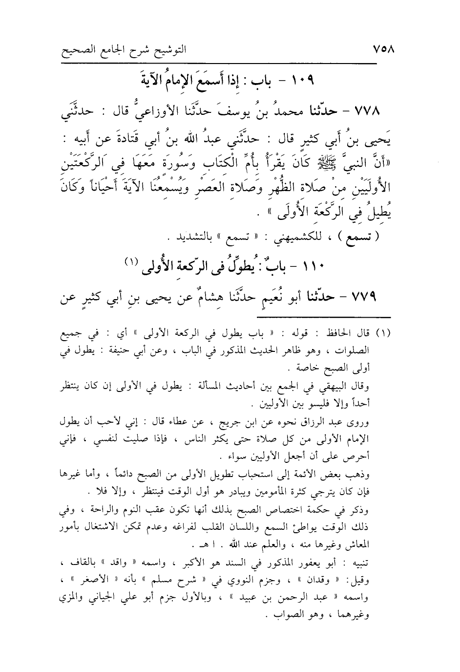 778 - حَدَّثَنَا مُحَمَّدُ بْنُ يُوسُفَ، حَدَّثَنَا الأَوْزَاعِيُّ، حَدَّثَنِي يَحْيَى بْنُ أَبِي كَثِيرٍ، حَدَّثَنِي عَبْدُ اللَّهِ بْنُ أَبِي قَتَادَةَ، عَنْ أَبِيهِ: «أَنَّ النَّبِيَّ صَلَّى اللهُ عَلَيْهِ وَسَلَّمَ كَانَ يَقْرَأُ بِأُمِّ الكِتَابِ وَسُورَةٍ مَعَهَا فِي الرَّكْعَتَيْنِ الأُولَيَيْنِ مِنْ صَلاَةِ الظُّهْرِ وَصَلاَةِ العَصْرِ، وَيُسْمِعُنَا الآيَةَ أَحْيَانًا وَكَانَ يُطِيلُ فِي الرَّكْعَةِ الأُولَى».