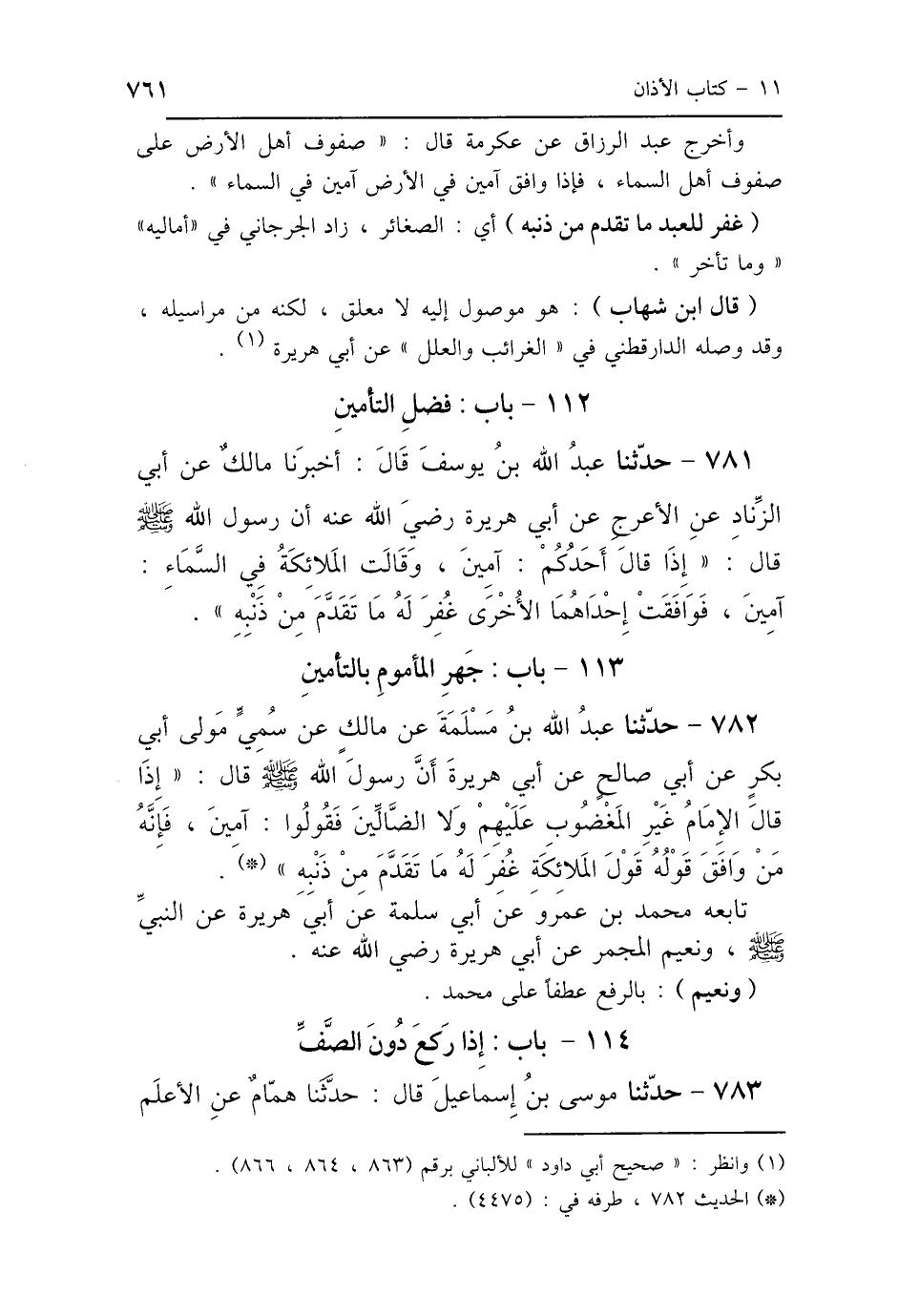 781 - حَدَّثَنَا عَبْدُ اللَّهِ بْنُ يُوسُفَ، أَخْبَرَنَا مَالِكٌ، عَنْ أَبِي الزِّنَادِ، عَنِ الأَعْرَجِ، عَنْ أَبِي هُرَيْرَةَ رَضِيَ اللَّهُ عَنْهُ: أَنَّ رَسُولَ اللَّهِ صَلَّى اللهُ عَلَيْهِ وَسَلَّمَ قَالَ: " إِذَا قَالَ أَحَدُكُمْ: آمِينَ، وَقَالَتِ المَلاَئِكَةُ فِي السَّمَاءِ: آمِينَ، فَوَافَقَتْ إِحْدَاهُمَا الأُخْرَى غُفِرَ لَهُ مَا تَقَدَّمَ مِنْ ذَنْبِهِ".