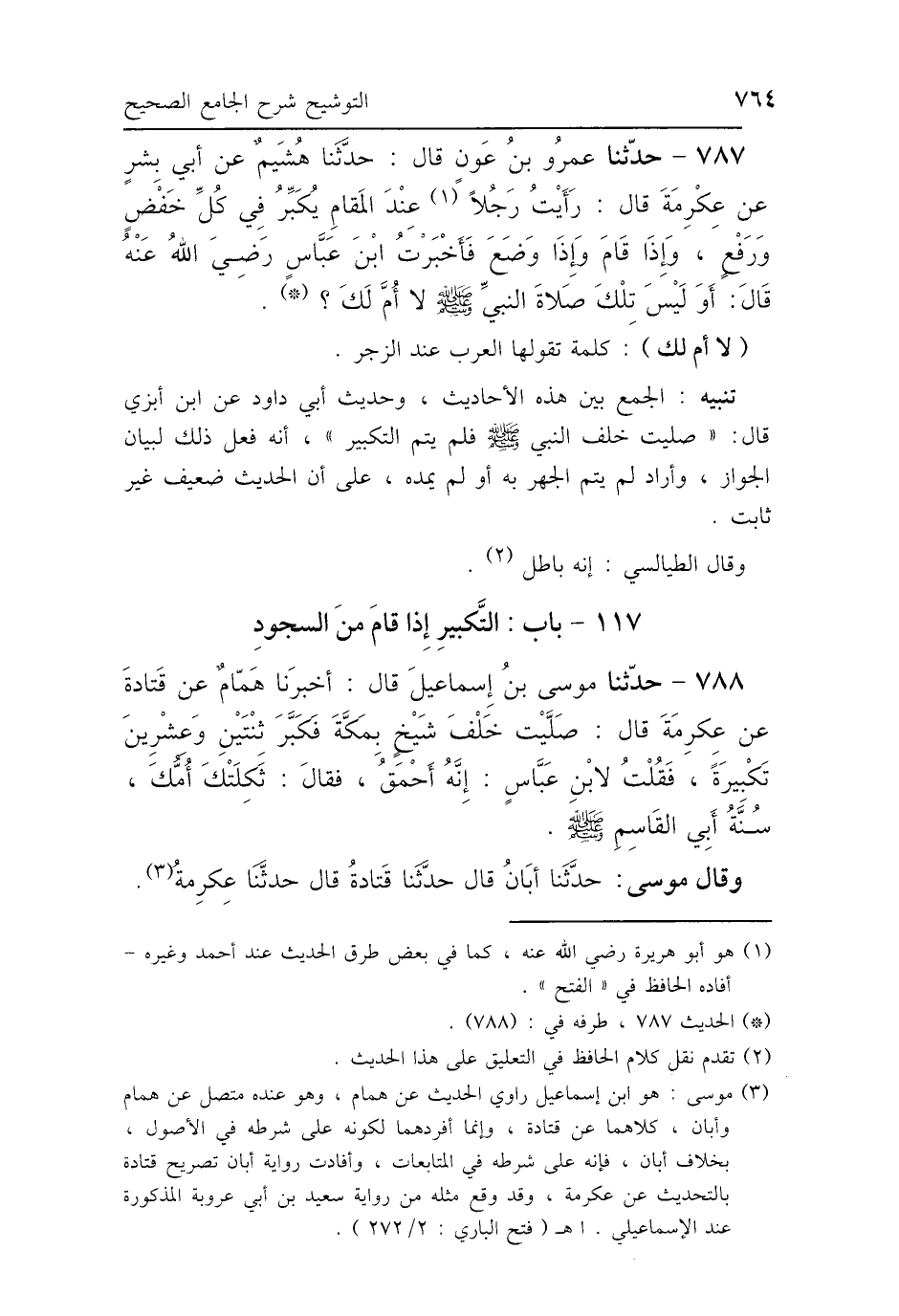 787 - حَدَّثَنَا عَمْرُو بْنُ عَوْنٍ، قَالَ: حَدَّثَنَا هُشَيْمٌ، عَنْ أَبِي بِشْرٍ، عَنْ عِكْرِمَةَ، قَالَ: رَأَيْتُ رَجُلًا عِنْدَ المَقَامِ، «يُكَبِّرُ فِي كُلِّ خَفْضٍ وَرَفْعٍ، وَإِذَا قَامَ وَإِذَا وَضَعَ»، فَأَخْبَرْتُ ابْنَ عَبَّاسٍ رَضِيَ اللَّهُ عَنْهُ، قَالَ: أَوَلَيْسَ تِلْكَ صَلاَةَ النَّبِيِّ صَلَّى اللهُ عَلَيْهِ وَسَلَّمَ، لاَ أُمَّ لَكَ.