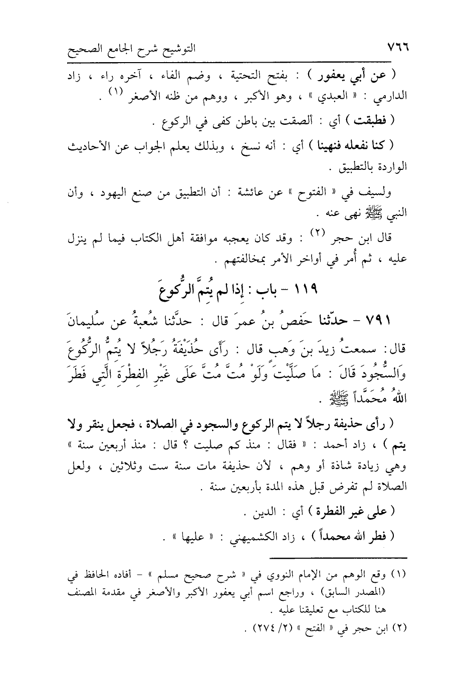 (رأى حذيفة رجلًا لا يتم الركوع والسجود في الصَّلاة، فجعل ينقر ولا يتم)، زاد أحمد: "فقال: منذ كم صليت؟ قال: منذ أربعين سنة" وهي زيادة شاذة أو وهم، لأنَّ حذيفة مات سنة ست وثلاثين، ولعل الصَّلاة لم تفرض قبل هذه المدة بأربعين سنة.