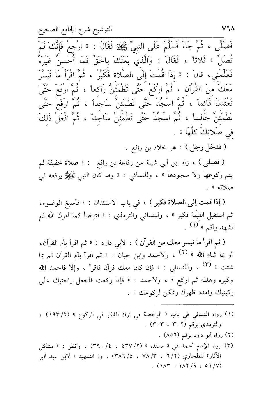 (فصلَّى)، زاد ابن أبي شيبة عن رفاعة بن رافع: "صلاة خفيفة لم يتم ركوعها ولا سجودها"، وللنسائي: "وقد كان النَّبيُّ - صَلَّى الله عليه وسلم - يرفعه في صلاته".