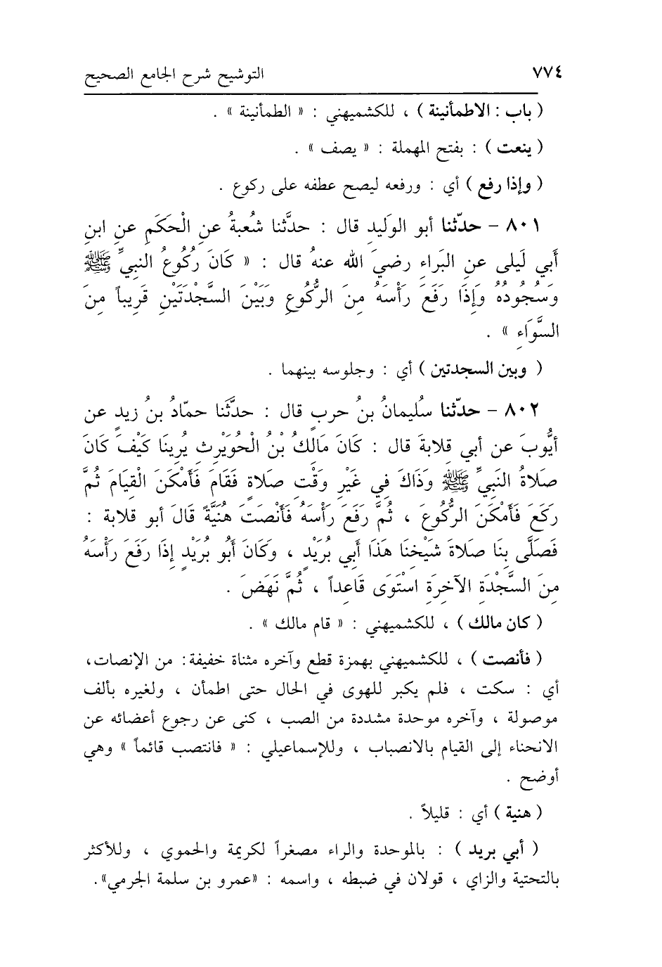 802 - حَدَّثَنَا سُلَيْمَانُ بْنُ حَرْبٍ، قَالَ: حَدَّثَنَا حَمَّادُ بْنُ زَيْدٍ، عَنْ أَيُّوبَ، عَنْ أَبِي قِلاَبَةَ، قَالَ: كَانَ مَالِكُ بْنُ الحُوَيْرِثِ يُرِينَا كَيْفَ كَانَ صَلاَةُ النَّبِيِّ صَلَّى اللهُ عَلَيْهِ وَسَلَّمَ، وَذَاكَ فِي غَيْرِ وَقْتِ صَلاَةٍ، «فَقَامَ فَأَمْكَنَ القِيَامَ، ثُمَّ رَكَعَ فَأَمْكَنَ الرُّكُوعَ، ثُمَّ رَفَعَ رَأْسَهُ فَأَنْصَبَ هُنَيَّةً»، قَالَ: فَصَلَّى بِنَا صَلاَةَ شَيْخِنَا هَذَا أَبِي بُرَيْدٍ، وَكَانَ أَبُو بُرَيْدٍ: «إِذَا رَفَعَ رَأْسَهُ مِنَ السَّجْدَةِ الآخِرَةِ اسْتَوَى قَاعِدًا، ثُمَّ نَهَضَ».