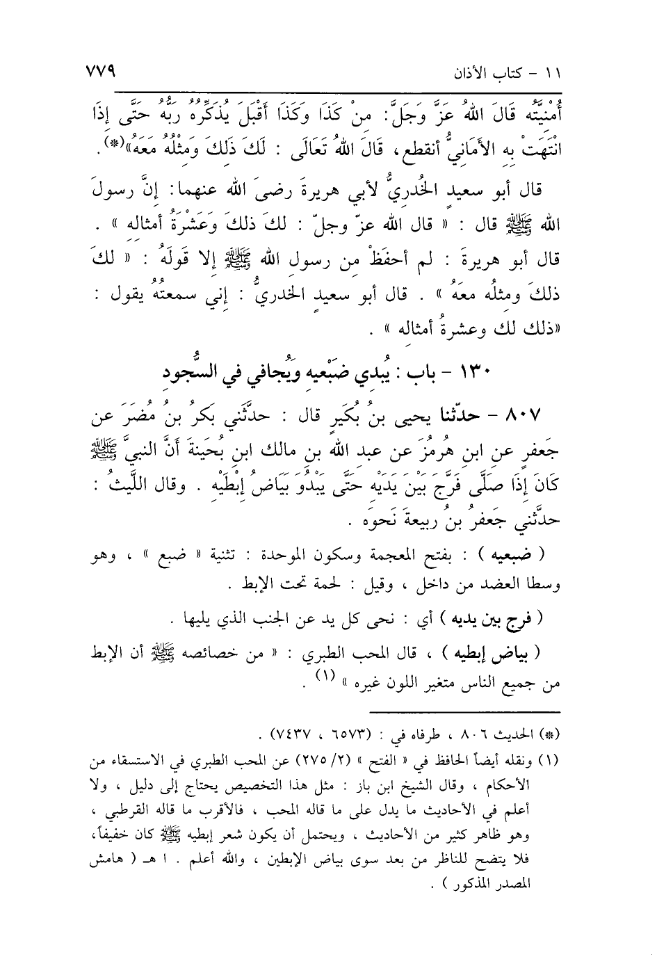 807 - حَدَّثَنَا يَحْيَى بْنُ بُكَيْرٍ، قَالَ: حَدَّثَنِي بَكْرُ بْنُ مُضَرَ، عَنْ جَعْفَرٍ، عَنِ ابْنِ هُرْمُزَ، عَنْ عَبْدِ اللَّهِ بْنِ مَالِكٍ ابْنِ بُحَيْنَةَ: «أَنَّ النَّبِيَّ صَلَّى اللهُ عَلَيْهِ وَسَلَّمَ كَانَ إِذَا صَلَّى فَرَجَ بَيْنَ يَدَيْهِ حَتَّى يَبْدُوَ بَيَاضُ إِبْطَيْهِ» وَقَالَ اللَّيْثُ: حَدَّثَنِي جَعْفَرُ بْنُ رَبِيعَةَ، نَحْوَهُ.