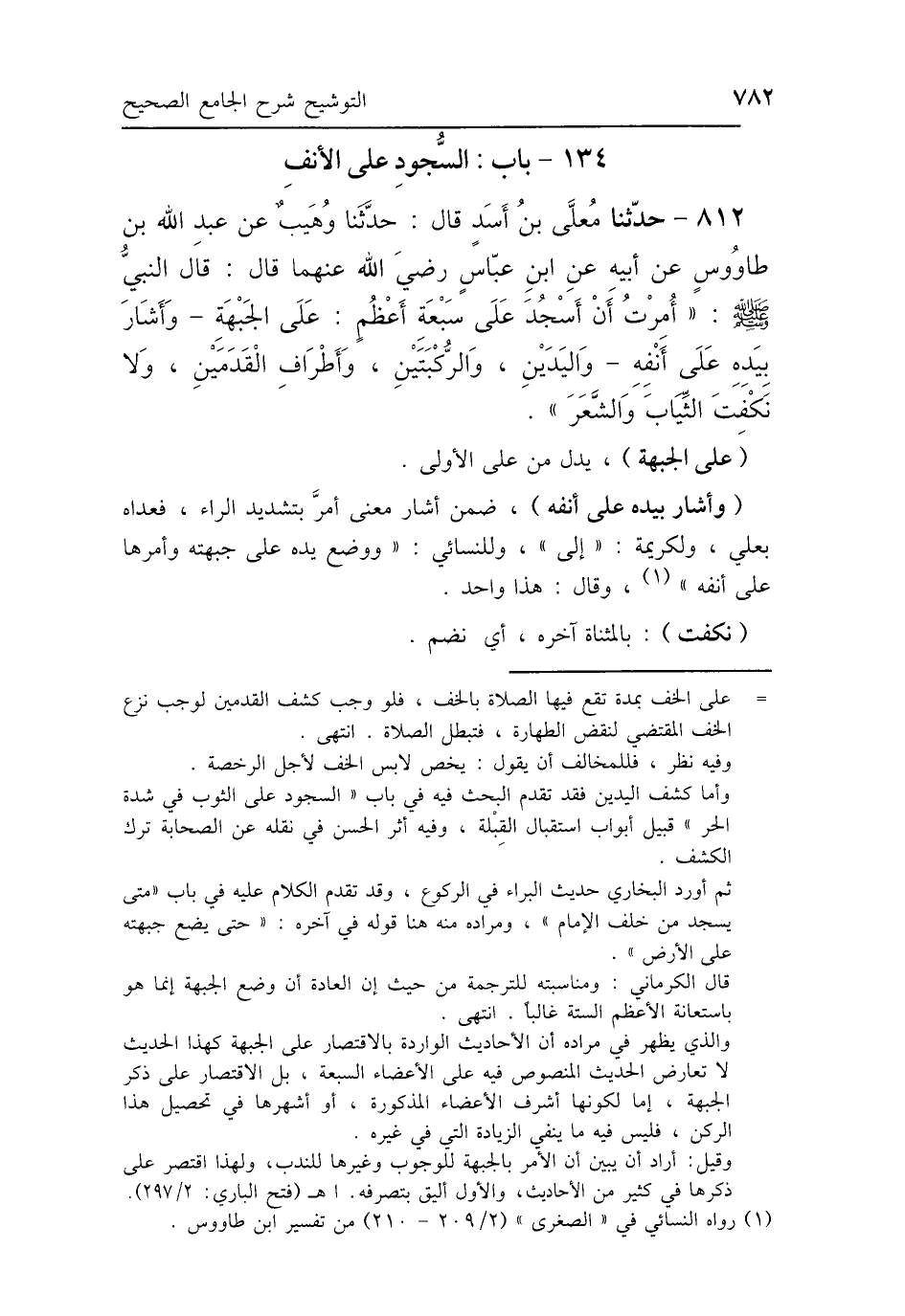 812 - حَدَّثَنَا مُعَلَّى بْنُ أَسَدٍ، قَالَ: حَدَّثَنَا وُهَيْبٌ، عَنْ عَبْدِ اللَّهِ بْنِ طَاوُسٍ، عَنْ أَبِيهِ، عَنِ ابْنِ عَبَّاسٍ رَضِيَ اللَّهُ عَنْهُمَا، قَالَ: قَالَ النَّبِيُّ صَلَّى اللهُ عَلَيْهِ وَسَلَّمَ: «أُمِرْتُ أَنْ أَسْجُدَ عَلَى سَبْعَةِ أَعْظُمٍ عَلَى الجَبْهَةِ، وَأَشَارَ بِيَدِهِ عَلَى أَنْفِهِ وَاليَدَيْنِ وَالرُّكْبَتَيْنِ، وَأَطْرَافِ القَدَمَيْنِ وَلاَ نَكْفِتَ الثِّيَابَ وَالشَّعَرَ».