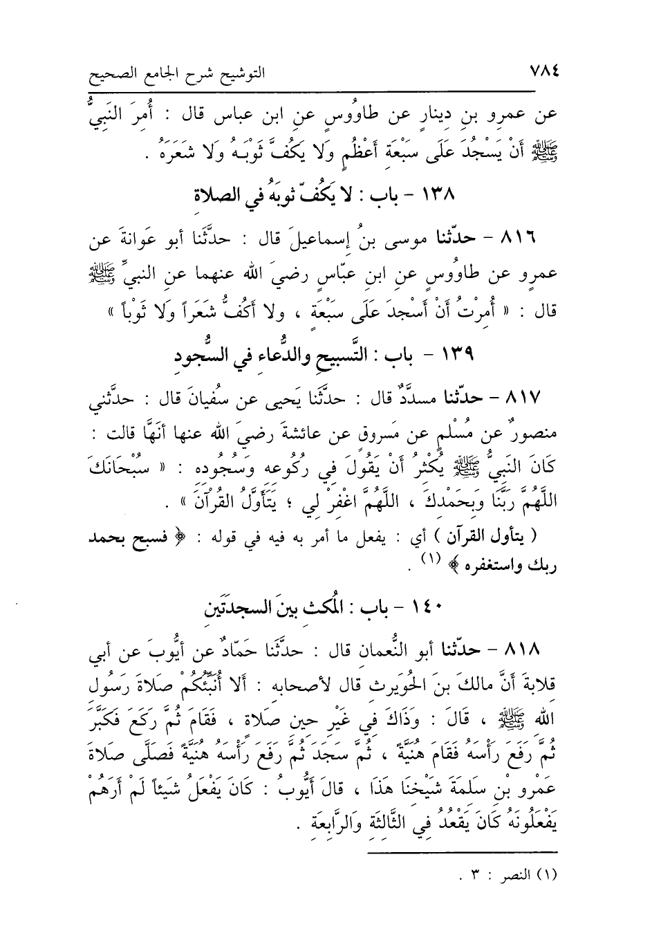 816 - حَدَّثَنَا مُوسَى بْنُ إِسْمَاعِيلَ، قَالَ: حَدَّثَنَا أَبُو عَوَانَةَ، عَنْ عَمْرٍو، عَنْ طَاوُسٍ، عَنِ ابْنِ عَبَّاسٍ رَضِيَ اللَّهُ عَنْهُمَا، عَنِ النَّبِيِّ صَلَّى اللهُ عَلَيْهِ وَسَلَّمَ قَالَ: «أُمِرْتُ أَنْ أَسْجُدَ عَلَى سَبْعَةٍ، لاَ أَكُفُّ شَعَرًا وَلاَ ثَوْبًا».