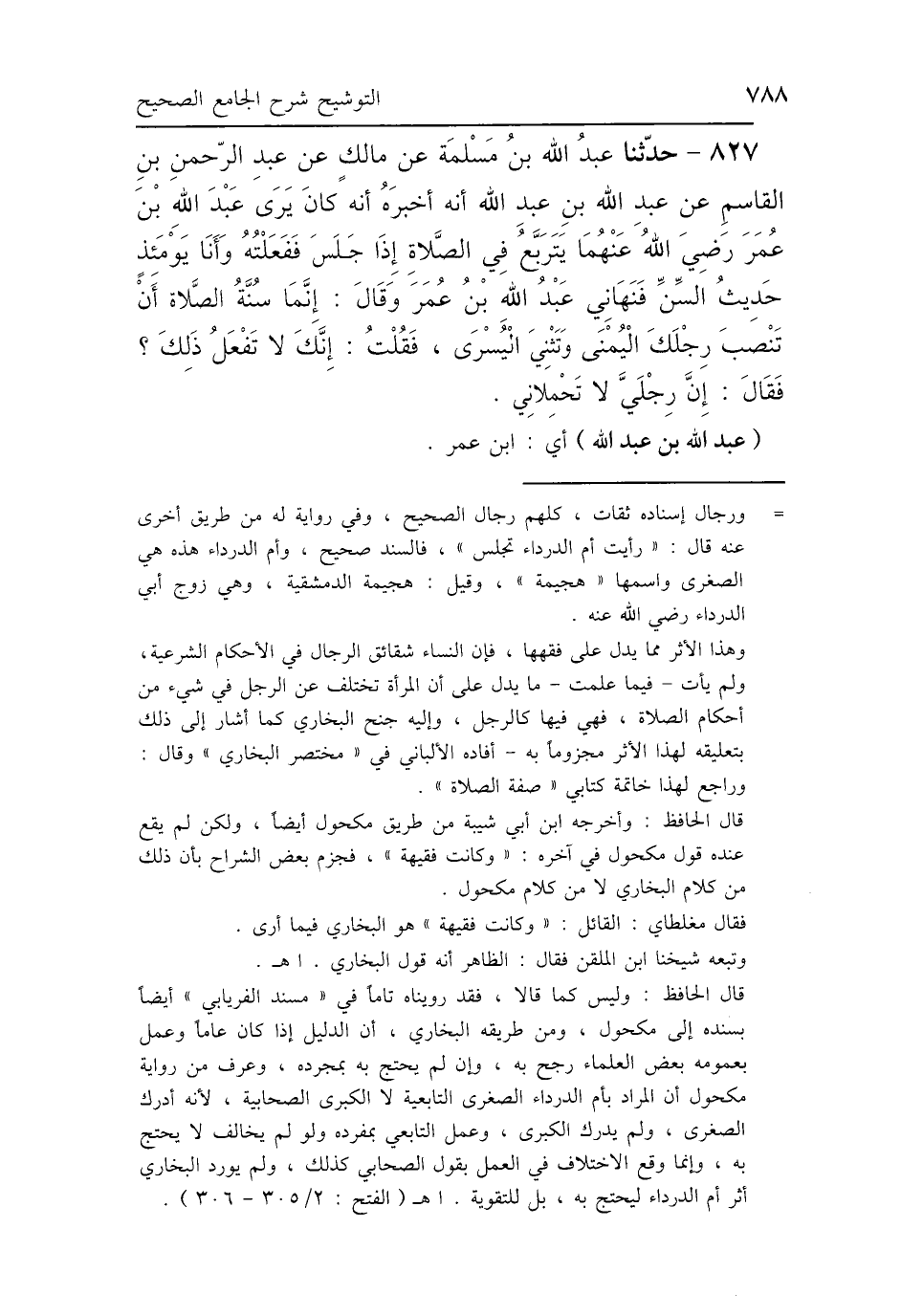827 - حَدَّثَنَا عَبْدُ اللَّهِ بْنُ مَسْلَمَةَ، عَنْ مَالِكٍ، عَنْ عَبْدِ الرَّحْمَنِ بْنِ القَاسِمِ، عَنْ عَبْدِ اللَّهِ بْنِ عَبْدِ اللَّهِ، أَنَّهُ أَخْبَرَهُ: أَنَّهُ كَانَ يَرَى عَبْدَ اللَّهِ بْنَ عُمَرَ رَضِيَ اللَّهُ عَنْهُمَا، يَتَرَبَّعُ فِي الصَّلاَةِ إِذَا جَلَسَ، فَفَعَلْتُهُ وَأَنَا يَوْمَئِذٍ حَدِيثُ السِّنِّ، فَنَهَانِي عَبْدُ اللَّهِ بْنُ عُمَرَ، وَقَالَ: «إِنَّمَا سُنَّةُ الصَّلاَةِ أَنْ تَنْصِبَ رِجْلَكَ اليُمْنَى وَتَثْنِيَ اليُسْرَى»، فَقُلْتُ: إِنَّكَ تَفْعَلُ ذَلِكَ، فَقَالَ: إِنَّ رِجْلَيَّ لاَ تَحْمِلاَنِي.