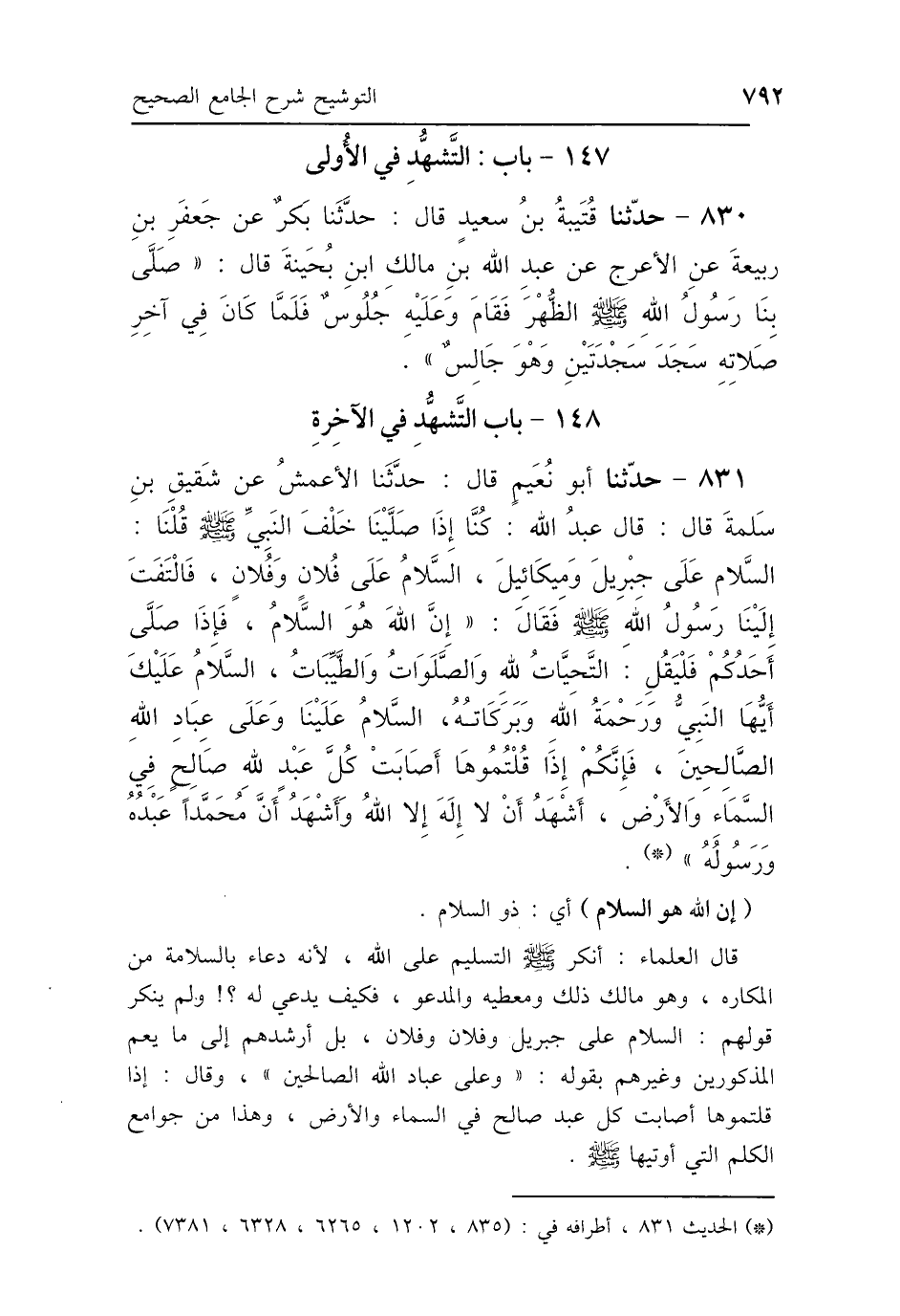 831 - حَدَّثَنَا أَبُو نُعَيْمٍ، قَالَ: حَدَّثَنَا الأَعْمَشُ، عَنْ شَقِيقِ بْنِ سَلَمَةَ، قَالَ: قَالَ عَبْدُ اللَّهِ: كُنَّا إِذَا صَلَّيْنَا خَلْفَ النَّبِيِّ صَلَّى اللهُ عَلَيْهِ وَسَلَّمَ، قُلْنَا: السَّلاَمُ عَلَى جِبْرِيلَ وَمِيكَائِيلَ السَّلاَمُ عَلَى فُلاَنٍ وَفُلاَنٍ، فَالْتَفَتَ إِلَيْنَا رَسُولُ اللَّهِ صَلَّى اللهُ عَلَيْهِ وَسَلَّمَ فَقَالَ: " إِنَّ اللَّهَ هُوَ السَّلاَمُ، فَإِذَا صَلَّى أَحَدُكُمْ، فَلْيَقُلْ: التَّحِيَّاتُ لِلَّهِ وَالصَّلَوَاتُ وَالطَّيِّبَاتُ، السَّلاَمُ عَلَيْكَ أَيُّهَا النَّبِيُّ وَرَحْمَةُ اللَّهِ وَبَرَكَاتُهُ، السَّلاَمُ عَلَيْنَا وَعَلَى عِبَادِ اللَّهِ الصَّالِحِينَ، فَإِنَّكُمْ إِذَا قُلْتُمُوهَا أَصَابَتْ كُلَّ عَبْدٍ لِلَّهِ صَالِحٍ فِي السَّمَاءِ وَالأَرْضِ، أَشْهَدُ أَنْ لاَ إِلَهَ إِلَّا اللَّهُ وَأَشْهَدُ أَنَّ مُحَمَّدًا عَبْدُهُ وَرَسُولُهُ".