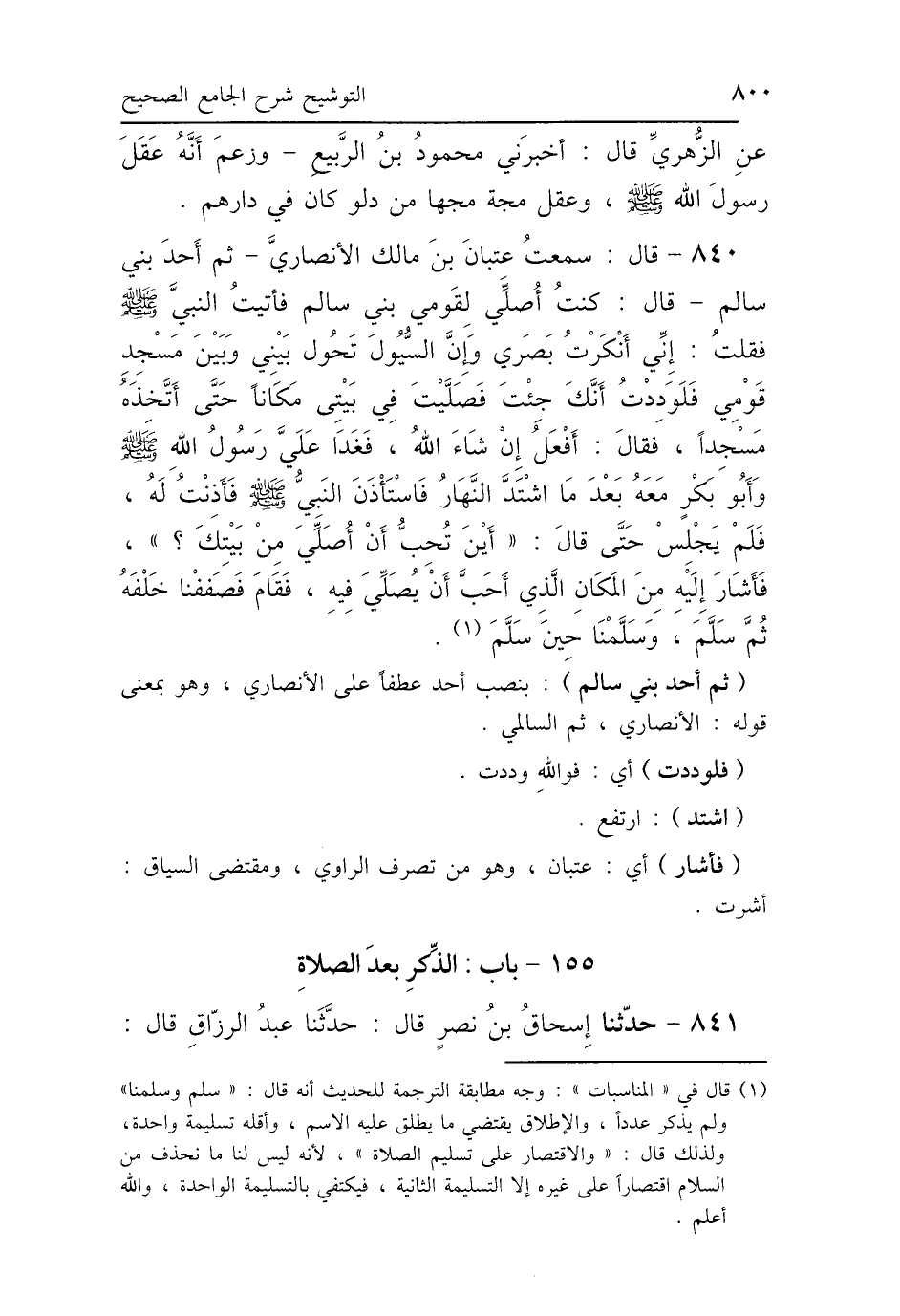 840 - قَالَ: سَمِعْتُ عِتْبَانَ بْنَ مَالِكٍ الأَنْصارِيَّ، ثُمَّ أَحَدَ بَنِي سَالِمٍ، قَالَ: كُنْتُ أُصَلِّي لِقَوْمِي بَنِي سَالِمٍ، فَأَتَيْتُ النَّبِيَّ صَلَّى اللهُ عَلَيْهِ وَسَلَّمَ، فَقُلْتُ: إِنِّي أَنْكَرْتُ بَصَرِي، وَإِنَّ السُّيُولَ تَحُولُ بَيْنِي وَبَيْنَ مَسْجِدِ قَوْمِي، فَلَوَدِدْتُ أَنَّكَ جِئْتَ، فَصَلَّيْتَ فِي بَيْتِي مَكَانًا حَتَّى أَتَّخِذَهُ مَسْجِدًا، فَقَالَ: «أَفْعَلُ إِنْ شَاءَ اللَّهُ»، فَغَدَا عَلَيَّ رَسُولُ اللَّهِ صَلَّى اللهُ عَلَيْهِ وَسَلَّمَ وَأَبُو بَكْرٍ مَعَهُ بَعْدَ مَا اشْتَدَّ النَّهَارُ، فَاسْتَأْذَنَ النَّبِيُّ صَلَّى اللهُ عَلَيْهِ وَسَلَّمَ، فَأَذِنْتُ لَهُ، فَلَمْ يَجْلِسْ حَتَّى قَالَ: «أَيْنَ تُحِبُّ أَنْ أُصَلِّيَ مِنْ بَيْتِكَ؟»، فَأَشَارَ إِلَيْهِ مِنَ المَكَانِ الَّذِي أَحَبَّ أَنْ يُصَلِّيَ فِيهِ، فَقَامَ، فَصَفَفْنَا خَلْفَهُ، ثُمَّ سَلَّمَ وَسَلَّمْنَا حِينَ سَلَّمَ.