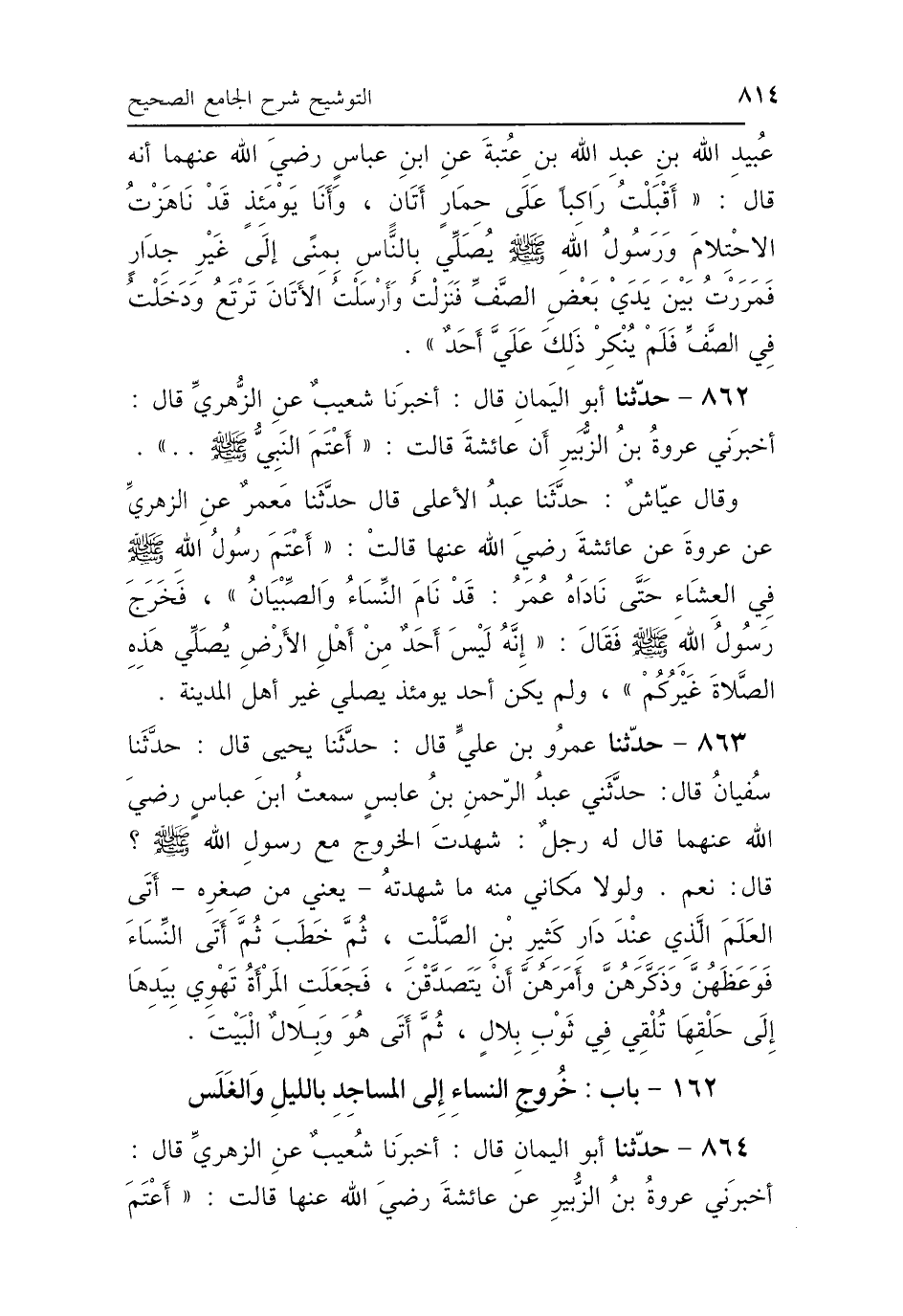 862 - حَدَّثَنَا أَبُو اليَمَانِ، قَالَ: أَخْبَرَنَا شُعَيْبٌ، عَنِ الزُّهْرِيِّ، قَالَ: أَخْبَرَنِي عُرْوَةُ بْنُ الزُّبَيْرِ، أَنَّ عَائِشَةَ، قَالَتْ: أَعْتَمَ النَّبِيُّ صَلَّى اللهُ عَلَيْهِ وَسَلَّمَ وَقَالَ عَيَّاشٌ: حَدَّثَنَا عَبْدُ الأَعْلَى، حَدَّثَنَا مَعْمَرٌ، عَنِ الزُّهْرِيِّ، عَنْ عُرْوَةَ، عَنْ عَائِشَةَ رَضِيَ اللَّهُ عَنْهَا، قَالَتْ: أَعْتَمَ رَسُولُ اللَّهِ صَلَّى اللهُ عَلَيْهِ وَسَلَّمَ فِي العِشَاءِ حَتَّى نَادَاهُ عُمَرُ: قَدْ نَامَ النِّسَاءُ وَالصِّبْيَانُ، فَخَرَجَ رَسُولُ اللَّهِ صَلَّى اللهُ عَلَيْهِ وَسَلَّمَ فَقَالَ: «إِنَّهُ لَيْسَ أَحَدٌ مِنْ أَهْلِ الأَرْضِ يُصَلِّي هَذِهِ الصَّلاَةَ غَيْرُكُمْ»، وَلَمْ يَكُنْ أَحَدٌ يَوْمَئِذٍ يُصَلِّي غَيْرَ أَهْلِ المَدِينَةِ.