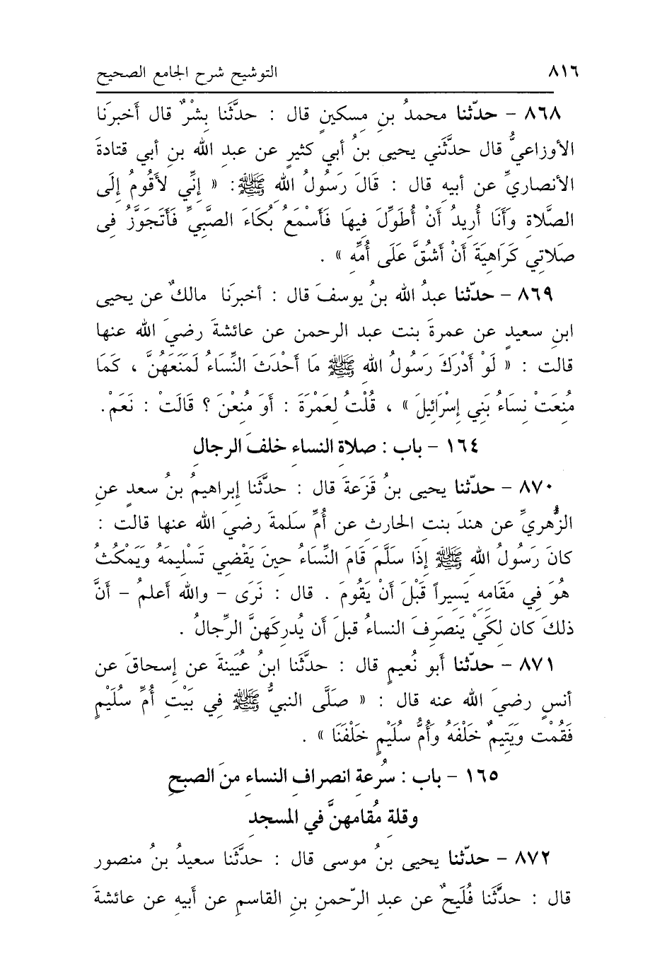 869 - حَدَّثَنَا عَبْدُ اللَّهِ بْنُ يُوسُفَ، قَالَ: أَخْبَرَنَا مَالِكٌ، عَنْ يَحْيَى بْنِ سَعِيدٍ، عَنْ عَمْرَةَ، عَنْ عَائِشَةَ رَضِيَ اللَّهُ عَنْهَا، قَالَتْ: «لَوْ أَدْرَكَ رَسُولُ اللَّهِ صَلَّى اللهُ عَلَيْهِ وَسَلَّمَ مَا أَحْدَثَ النِّسَاءُ لَمَنَعَهُنَّ كَمَا مُنِعَتْ نِسَاءُ بَنِي إِسْرَائِيلَ» قُلْتُ لِعَمْرَةَ: أَوَمُنِعْنَ؟ قَالَتْ: نَعَمْ.