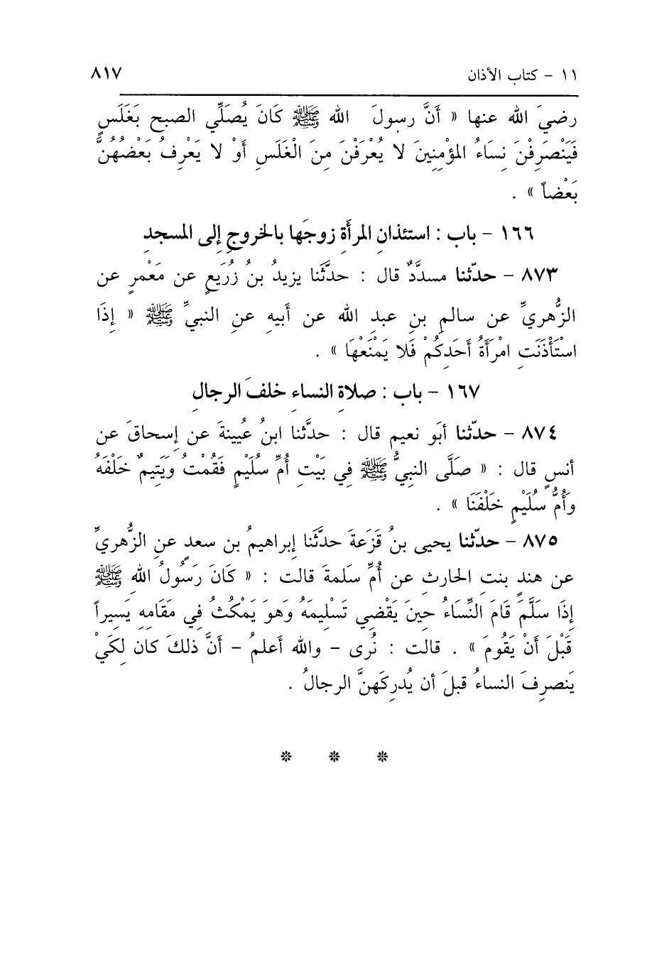 875 - حَدَّثَنَا يَحْيَى بْنُ قَزَعَةَ، قَالَ: حَدَّثَنَا إِبْرَاهِيمُ بْنُ سَعْدٍ، عَنِ الزُّهْرِيِّ، عَنْ هِنْدٍ بِنْتِ الحَارِثِ، عَنْ أُمِّ سَلَمَةَ رَضِيَ اللَّهُ عَنْهَا، قَالَتْ: «كَانَ رَسُولُ اللَّهِ صَلَّى اللهُ عَلَيْهِ وَسَلَّمَ إِذَا سَلَّمَ قَامَ النِّسَاءُ حِينَ يَقْضِي تَسْلِيمَهُ، وَيَمْكُثُ هُوَ فِي مَقَامِهِ يَسِيرًا قَبْلَ أَنْ يَقُومَ»، قَالَ: نَرَى - وَاللَّهُ أَعْلَمُ - أَنَّ ذَلِكَ كَانَ لِكَيْ يَنْصَرِفَ النِّسَاءُ، قَبْلَ أَنْ يُدْرِكَهُنَّ أَحَدٌ مِنَ الرِّجَالِ.
