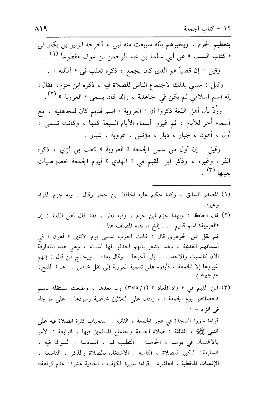 وقيل: إن أول من سمى الجمعة "العروبة" كعب بن لؤي، ذكره الفراء وغيره، وذكر ابن القيم في "الهدي" ليوم الجمعة خصوصيات بعينها.