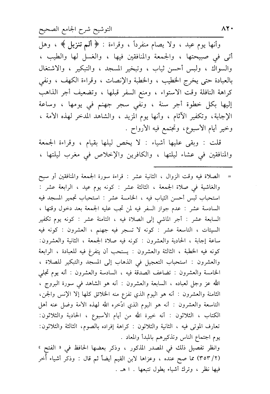 وأنها يوم عيد، ولا يصام منفردًا، وقراءة: {الم تَنْزِيلُ}، وهل أتى في صبيحتها، والجمعة والمنافقين فيها، والغسل لها والطيب، والسواك، ولبس أحسن ثياب، وتبخير المسجد، والتبكير، والاشتغال بالعبادة حتى يخرج الخطيب، والخطبة والإنصات، وقراءة الكهف، ونفي كراهة النافلة وقت الاستواء، ومنع السفر قبلها، وتضعيف أجر الذاهب إليها بكل خطوة أجر سنة، ونفي سجر جهنم في يومها، وساعة الإجابة، وتكفير الآثام، وأنها يوم المزيد، والشاهد المدخر لهذه الأمة، وخير أيام الأسبوع، وتجتمع فيه الأرواح.