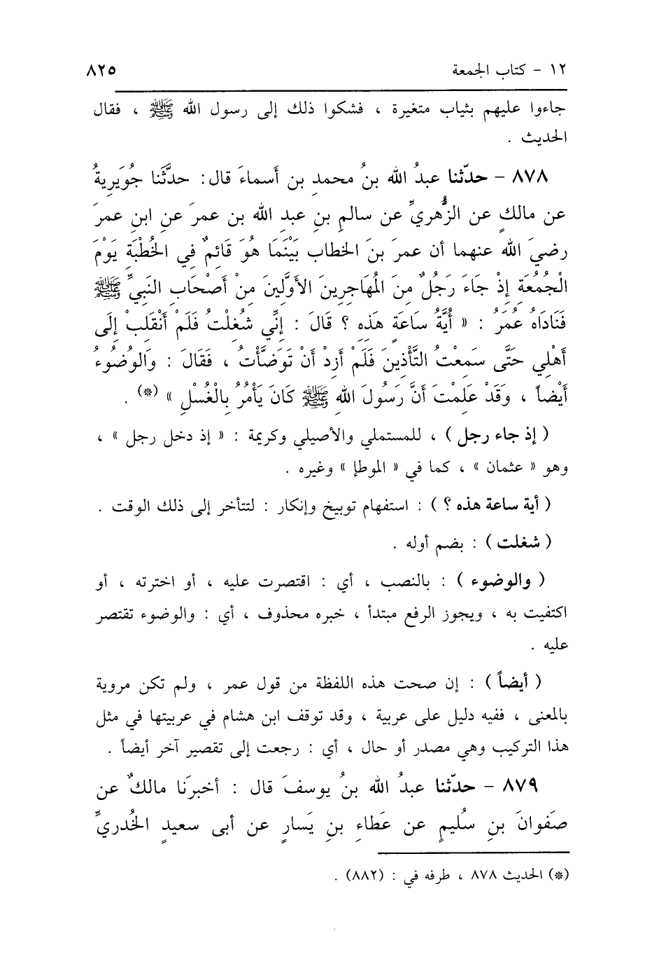878 - حَدَّثَنَا عَبْدُ اللَّهِ بْنُ مُحَمَّدِ بْنِ أَسْمَاءَ، قَالَ: أَخْبَرَنَا جُوَيْرِيَةُ بْنُ أَسْمَاءَ، عَنْ مَالِكٍ، عَنِ الزُّهْرِيِّ، عَنْ سَالِمِ بْنِ عَبْدِ اللَّهِ بْنِ عُمَرَ، عَنِ ابْنِ عُمَرَ رَضِيَ اللَّهُ عَنْهُمَا: أَنَّ عُمَرَ بْنَ الخَطَّابِ، بَيْنَمَا هُوَ قَائِمٌ فِي الخُطْبَةِ يَوْمَ الجُمُعَةِ إِذْ دَخَلَ رَجُلٌ مِنَ المُهَاجِرِينَ الأَوَّلِينَ مِنْ أَصْحَابِ النَّبِيِّ صَلَّى اللهُ عَلَيْهِ وَسَلَّمَ، فَنَادَاهُ عُمَرُ: أَيَّةُ سَاعَةٍ هَذِهِ؟ قَالَ: إِنِّي شُغِلْتُ، فَلَمْ أَنْقَلِبْ إِلَى أَهْلِي حَتَّى سَمِعْتُ التَّأْذِينَ، فَلَمْ أَزِدْ أَنْ تَوَضَّأْتُ، فَقَالَ: وَالوُضُوءُ أَيْضًا، وَقَدْ عَلِمْتَ «أَنَّ رَسُولَ اللَّهِ صَلَّى اللهُ عَلَيْهِ وَسَلَّمَ كَانَ يَأْمُرُ بِالْغُسْلِ».