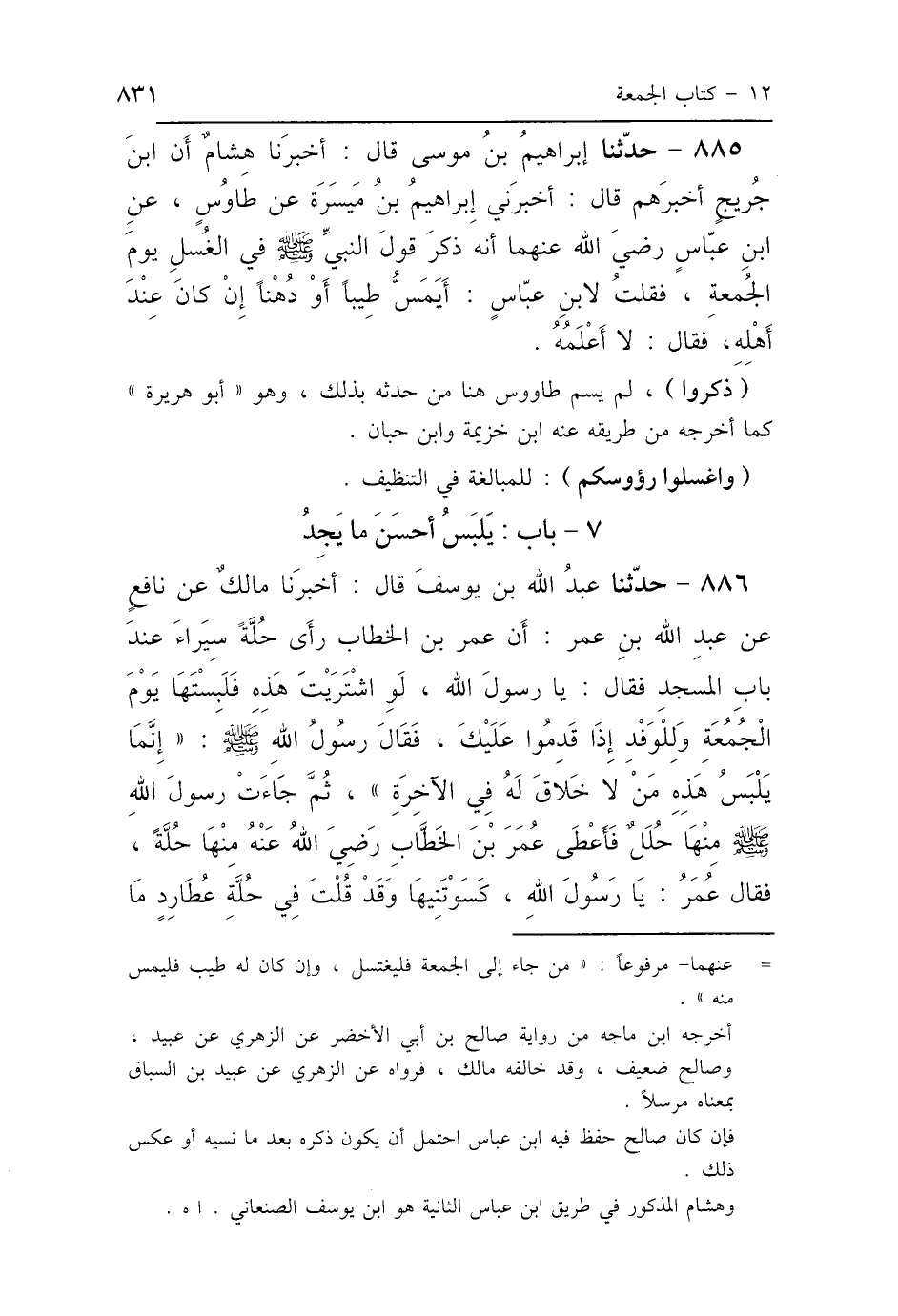885 - حَدَّثَنَا إِبْرَاهِيمُ بْنُ مُوسَى، قَالَ: أَخْبَرَنَا هِشَامٌ، أَنَّ ابْنَ جُرَيْجٍ أَخْبَرَهُمْ، قَالَ: أَخْبَرَنِي إِبْرَاهِيمُ بْنُ مَيْسَرَةَ، عَنْ طَاوُسٍ، عَنِ ابْنِ عَبَّاسٍ رَضِيَ اللَّهُ عَنْهُمَا: «أَنَّهُ ذَكَرَ قَوْلَ النَّبِيِّ صَلَّى اللهُ عَلَيْهِ وَسَلَّمَ فِي الغُسْلِ يَوْمَ الجُمُعَةِ»، فَقُلْتُ لِابْنِ عَبَّاسٍ: أَيَمَسُّ طِيبًا أَوْ دُهْنًا إِنْ كَانَ عِنْدَ أَهْلِهِ؟ فَقَالَ: لاَ أَعْلَمُهُ.