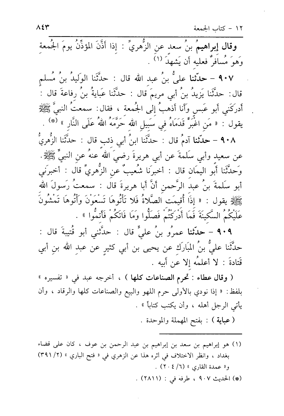 907 - حَدَّثَنَا عَلِيُّ بْنُ عَبْدِ اللَّهِ، قَالَ: حَدَّثَنَا الوَلِيدُ بْنُ مُسْلِمٍ، قَالَ: حَدَّثَنَا يَزِيدُ بْنُ أَبِي مَرْيَمَ الأَنْصَارِيُّ، قَالَ: حَدَّثَنَا عَبَايَةُ بْنُ رِفَاعَةَ، قَالَ: أَدْرَكَنِي أَبُو عَبْسٍ وَأَنَا أَذْهَبُ إِلَى الجُمُعَةِ، فَقَالَ: سَمِعْتُ النَّبِيَّ صَلَّى اللهُ عَلَيْهِ وَسَلَّمَ يَقُولُ: «مَنِ اغْبَرَّتْ قَدَمَاهُ فِي سَبِيلِ اللَّهِ حَرَّمَهُ اللَّهُ عَلَى النَّارِ».