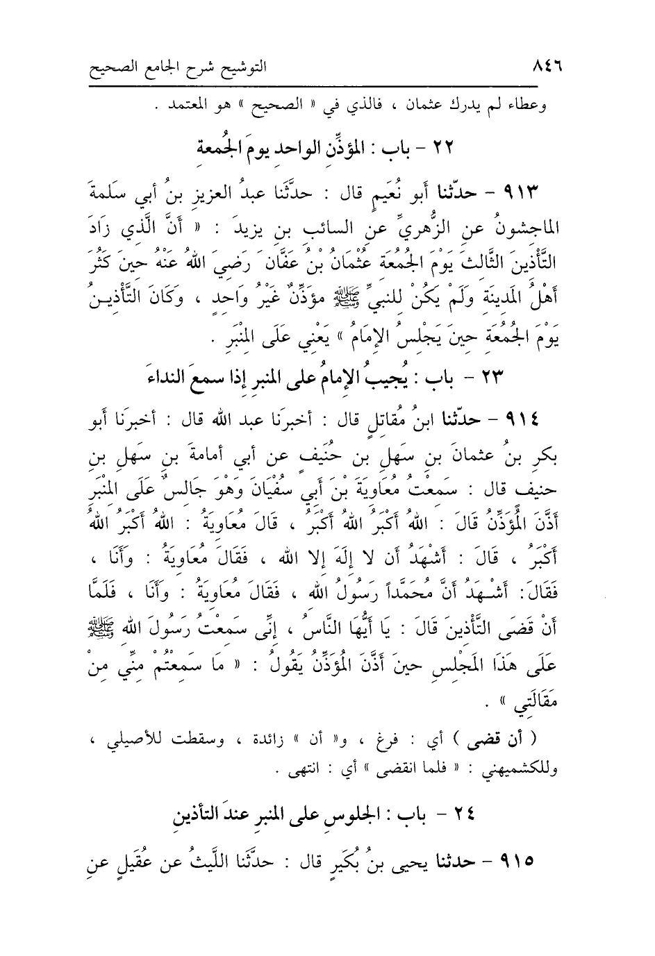913 - حَدَّثَنَا أَبُو نُعَيْمٍ، قَالَ: حَدَّثَنَا عَبْدُ العَزِيزِ بْنُ أَبِي سَلَمَةَ المَاجِشُونُ، عَنِ الزُّهْرِيِّ، عَنِ السَّائِبِ بْنِ يَزِيدَ، «أَنَّ الَّذِي زَادَ التَّأْذِينَ الثَّالِثَ يَوْمَ الجُمُعَةِ عُثْمَانُ بْنُ عَفَّانَ رَضِيَ اللَّهُ عَنْهُ، حِينَ كَثُرَ أَهْلُ المَدِينَةِ وَلَمْ يَكُنْ لِلنَّبِيِّ صَلَّى اللهُ عَلَيْهِ وَسَلَّمَ مُؤَذِّنٌ غَيْرَ وَاحِدٍ، وَكَانَ التَّأْذِينُ يَوْمَ الجُمُعَةِ حِينَ يَجْلِسُ الإِمَامُ» يَعْنِي عَلَى المِنْبَرِ.