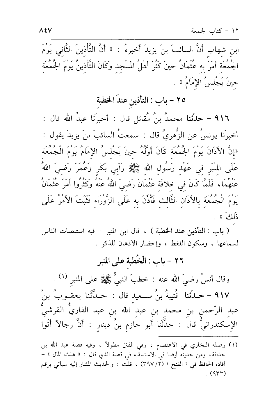 ابْنِ شِهَابٍ، أَنَّ السَّائِبَ بْنَ يَزِيدَ، أَخْبَرَهُ: أَنَّ «التَّأْذِينَ الثَّانِيَ يَوْمَ الجُمُعَةِ، أَمَرَ بِهِ عُثْمَانُ بْنُ عَفَّانَ رَضِيَ اللَّهُ عَنْهُ، حِينَ كَثُرَ أَهْلُ المَسْجِدِ، وَكَانَ التَّأْذِينُ يَوْمَ الجُمُعَةِ حِينَ يَجْلِسُ الإِمَامُ».