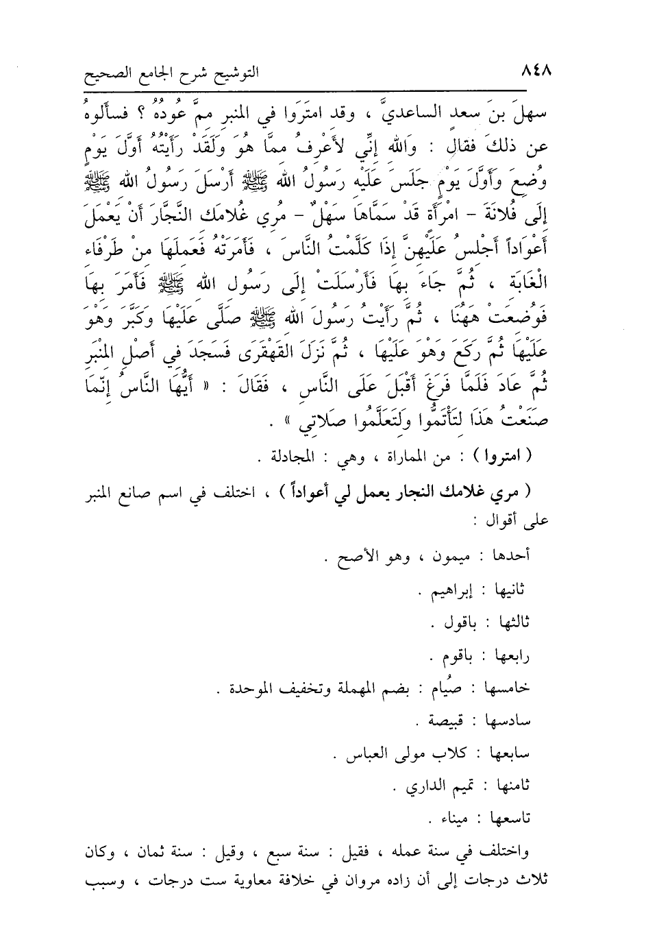 سَهْلَ بْنَ سَعْدٍ السَّاعِدِيَّ، وَقَدْ امْتَرَوْا فِي المِنْبَرِ مِمَّ عُودُهُ، فَسَأَلُوهُ عَنْ ذَلِكَ، فَقَالَ: وَاللَّهِ إِنِّي لَأَعْرِفُ مِمَّا هُوَ، وَلَقَدْ رَأَيْتُهُ أَوَّلَ يَوْمٍ وُضِعَ، وَأَوَّلَ يَوْمٍ جَلَسَ عَلَيْهِ رَسُولُ اللَّهِ صَلَّى اللهُ عَلَيْهِ وَسَلَّمَ، أَرْسَلَ رَسُولُ اللَّهِ صَلَّى اللهُ عَلَيْهِ وَسَلَّمَ إِلَى فُلاَنَةَ - امْرَأَةٍ مِنَ الأَنْصَارِ قَدْ سَمَّاهَا سَهْلٌ - «مُرِي غُلاَمَكِ النَّجَّارَ، أَنْ يَعْمَلَ لِي أَعْوَادًا، أَجْلِسُ عَلَيْهِنَّ إِذَا كَلَّمْتُ النَّاسَ» فَأَمَرَتْهُ فَعَمِلَهَا مِنْ طَرْفَاءِ الغَابَةِ، ثُمَّ جَاءَ بِهَا، فَأَرْسَلَتْ إِلَى رَسُولِ اللَّهِ صَلَّى اللهُ عَلَيْهِ وَسَلَّمَ، فَأَمَرَ بِهَا فَوُضِعَتْ هَا هُنَا، ثُمَّ رَأَيْتُ رَسُولَ اللَّهِ صَلَّى اللهُ عَلَيْهِ وَسَلَّمَ صَلَّى عَلَيْهَا وَكَبَّرَ وَهُوَ عَلَيْهَا، ثُمَّ رَكَعَ وَهُوَ عَلَيْهَا، ثُمَّ نَزَلَ القَهْقَرَى، فَسَجَدَ فِي أَصْلِ المِنْبَرِ ثُمَّ عَادَ، فَلَمَّا فَرَغَ أَقْبَلَ عَلَى النَّاسِ، فَقَالَ: «أَيُّهَا النَّاسُ، إِنَّمَا صَنَعْتُ هَذَا لِتَأْتَمُّوا وَلِتَعَلَّمُوا صَلاَتِي».