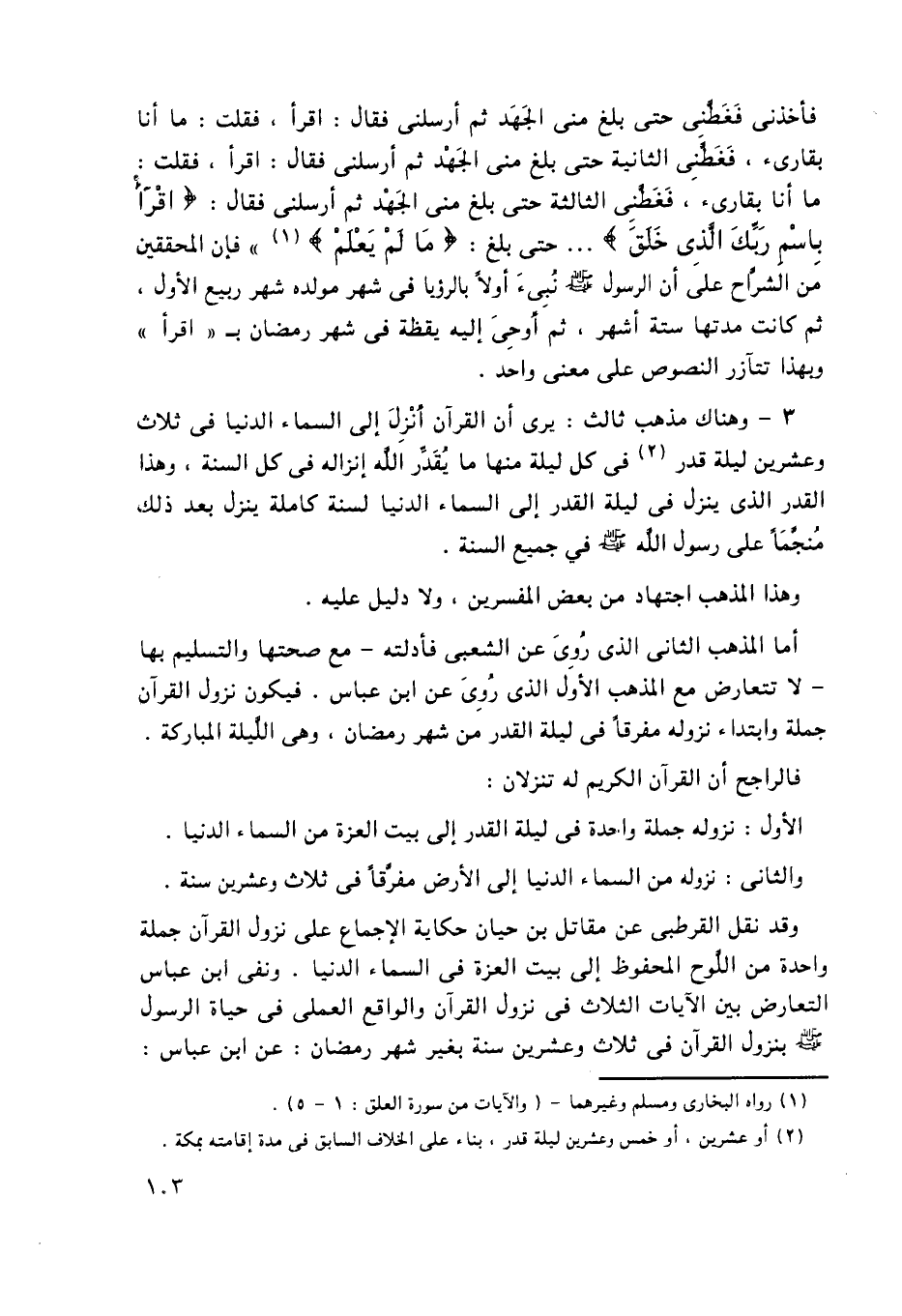 3- وهناك مذهب ثالث: يرى أن القرآن أُنزل إلى السماء الدنيا في ثلاث وعشرين ليلة قدر2 في كل ليلة منها ما يُقَدِّرُ الله إنزاله في كل السنة، وهذا القدر الذي ينزل في ليلة القدر إلى السماء الدنيا لسنة كاملة ينزل بعد ذلك مُنَجَّمًا على رسول الله -صلى الله عليه وسلم- في جميع السنة.