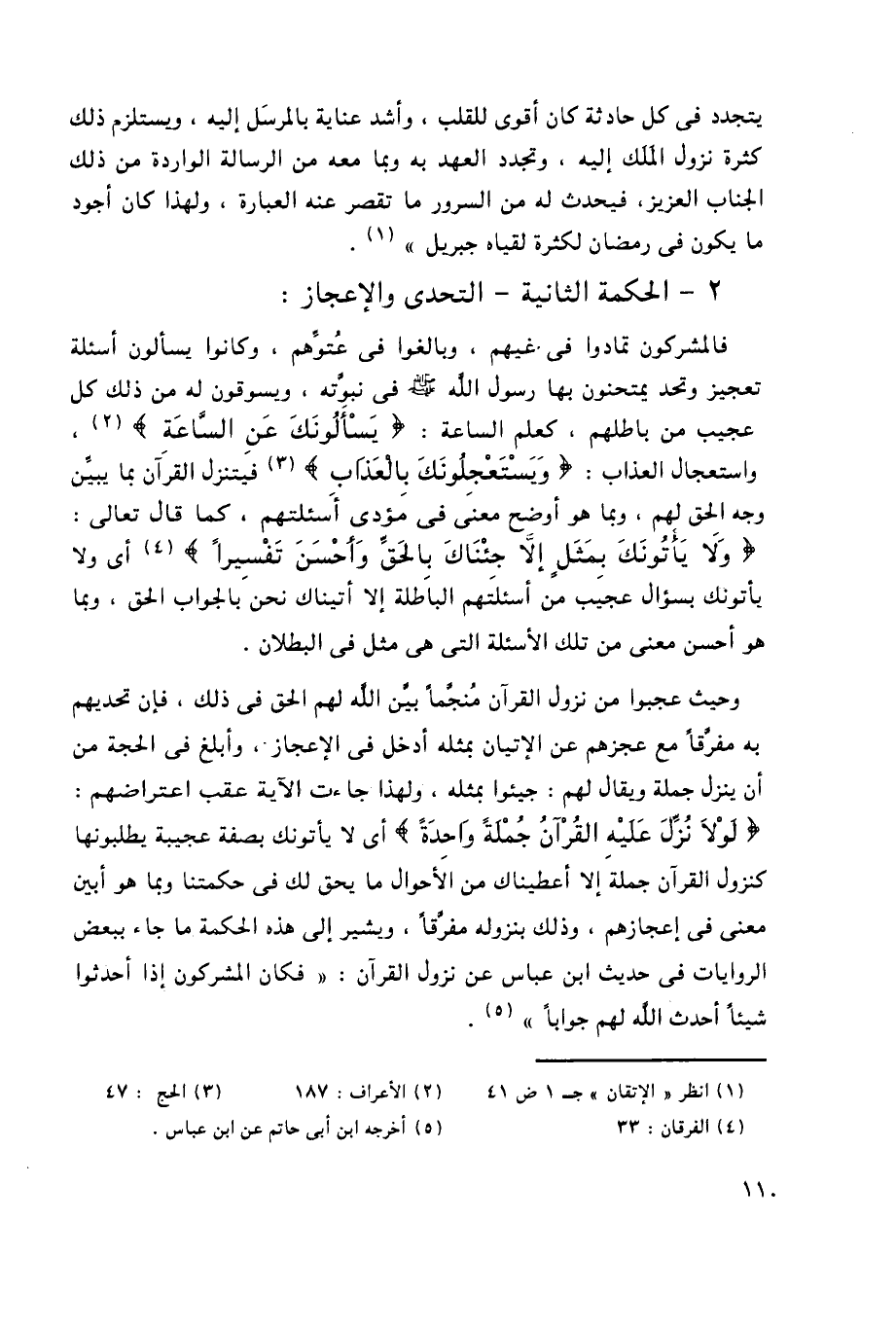 وحيث عجبوا من نزول القرآن مُنَجَّمًا بيَّن الله لهم الحق في ذلك، فإن تحديهم به مفرقًا مع عجزهم عن الإتيان بمثله أدخل في الإعجاز، وأبلغ في الحجة من أن ينزل جملة ويقال لهم: جيئوا بمثله، ولهذا جاءت الآية عقب اعتراضهم: {لَوْلا نُزِّلَ عَلَيْهِ الْقُرْآنُ جُمْلَةً وَاحِدَةً} أي لا يأتونك بصفة عجيبة يطلبونها كنزول القرآن جملة إلا أعطيناك من الأحوال ما يحق لك في حكمتنا وبما هو أبين معنًى في إعجازهم، وذلك بنزوله مفرقًا، ويشير إلى هذه الحكمة ما جاء ببعض الروايات في حديث ابن عباس عن نزول القرآن: "فكان المشركون إذا أحدثوا شيئًا أحدث الله لهم جوابًا"4.
