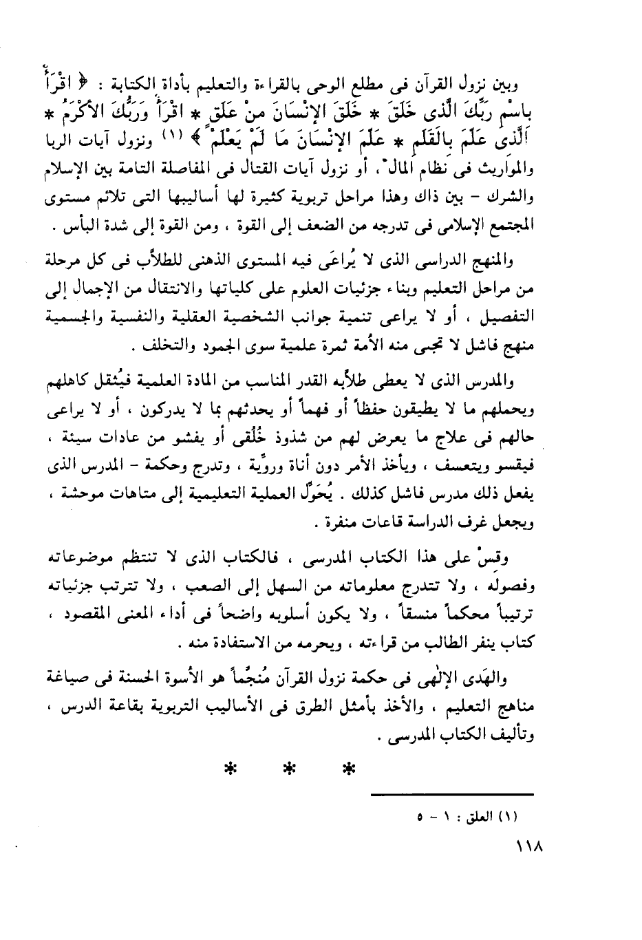 وبين نزول القرآن في مطلع الوحي بالقراءة والتعليم بأداة الكتابة: {اقْرَأْ بِاسْمِ رَبِّكَ الَّذِي خَلَقَ, خَلَقَ الإِنسَانَ مِنْ عَلَقٍ, اقْرَأْ وَرَبُّكَ الأَكْرَمُ, الَّذِي عَلَّمَ بِالْقَلَمِ, عَلَّمَ الإِنسَانَ مَا لَمْ يَعْلَمْ} 1, ونزول آيات الربا والمواريث في نظام المال، أو نزول آيات القتال في المفاصلة التامة بين الإسلام والشرك - بين ذاك وهذا مراحل تربوية كثيرة لها أساليبها التي تلائم مستوى المجتمع الإسلامي في تدرجه من الضعف إلى القوة، ومن القوة إلى شدة البأس.