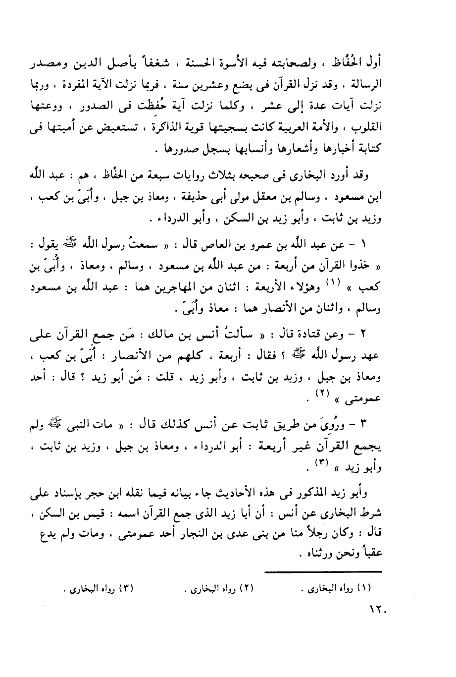 3- ورُوِي من طريق ثابت عن أنس كذلك قال: "مات النبي -صلى الله عليه وسلم- ولم يجمع القرآن غير أربعة: أبو الدرداء، ومعاذ بن جبل، وزيد بن ثابت، وأبو زيد"3.