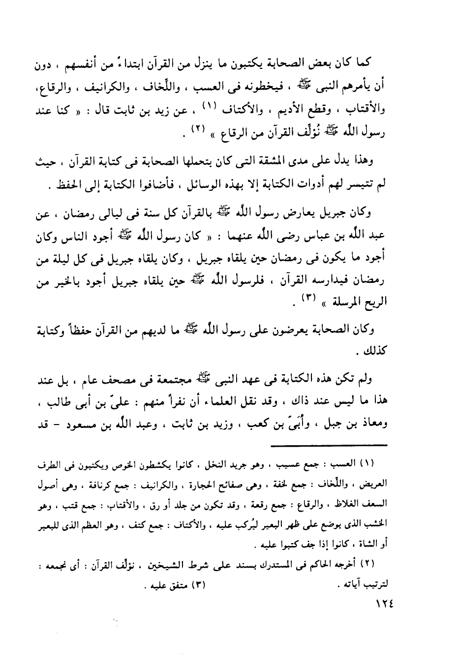 1 العسب: جمع عسيب، وهو جريد النخل، كانوا يكشطون الخوص ويكتبون في الطرف العريض، واللِّخاف: جمع لخفة، وهي صفائح الحجارة، والكرانيف: جمع كرنافة، وهي أصول السعف الغلاظ، والرقاع: جمع رقعة، وقد تكون من جلد أو رق، والأقتاب: جمع قتب، وهو الخشب الذي يوضع على ظهر البعير ليُركب عليه، والأكتاف: جمع كتف، وهو العظم الذي للبعير أو الشاة، كانوا إذا جف كتبوا عليه.