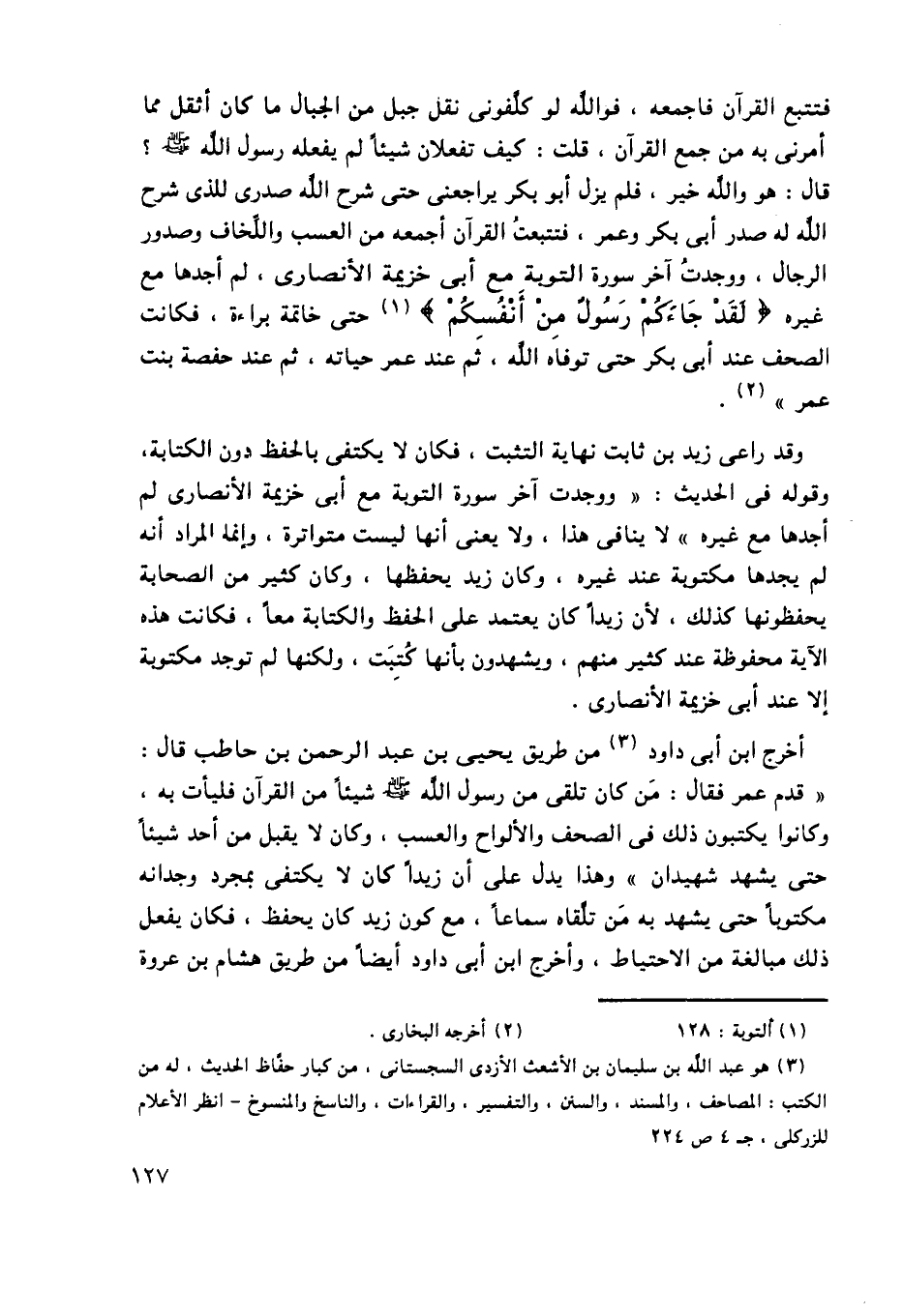 وقد راعى زيد بن ثابت نهاية التثبت، فكان لا يكتفي بالحفظ دون الكتابة، وقوله في الحديث: "ووجدت آخر سورة التوبة مع أبي خزيمة الأنصاري لم أجدها مع غيره" لا ينافي هذا، ولا يعني أنها ليست متواترة، وإنما المراد أنه لم يجدها مكتوبة عند غيره، وكان زيد يحفظها، وكان كثير من الصحابة يحفظونها كذلك، لأن زيدًا كان يعتمد على الحفظ والكتابة معًا، فكانت هذه الآية محفوظة عند كثير منهم، ويشهدون بأنها كُتِبت، ولكنها لم توجد مكتوبة إلا عند أبي خزيمة الأنصاري.