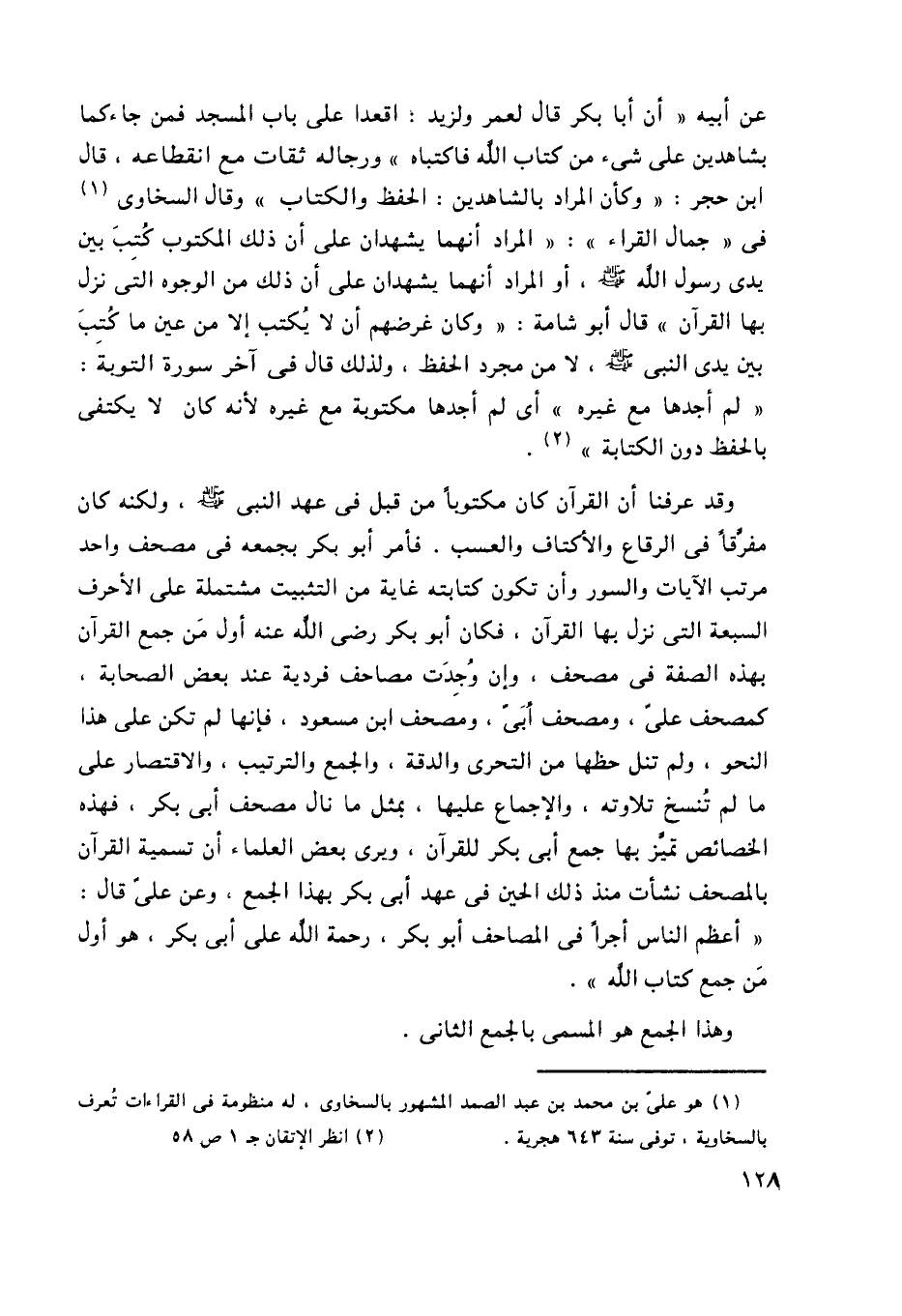 عن أبيه: أن أبا بكر قال لعمر ولزيد: اقعدا على باب المسجد فمن جاءكما بشاهدين على شيء من كتاب الله فاكتباه" ورجاله ثقات مع انقطاعه، قال ابن حجر: "وكأن المراد بالشاهدين: الحفظ والكتاب" وقال السخاوي1 في "جمال القراء": "والمراد أنهما يشهدان على أن ذلك المكتوب كُتِب بين يدي رسول الله -صلى الله عليه وسلم- أو المراد أنهما يشهدان على أن ذلك من الوجوه التي نزل بها القرآن" قال أبو شامة: "وكان غرضهم أن لا يُكتب إلا من عين ما كُتِبَ بين يدي النبي -صلى الله عليه وسلم- لا من مجرد الحفظ، ولذلك قال في آخر سورة التوبة: "لم أجدها مع غيره" أي لم أجدها مكتوبة مع غيره لأنه كان لا يكتفي بالحفظ دون الكتابة"2.