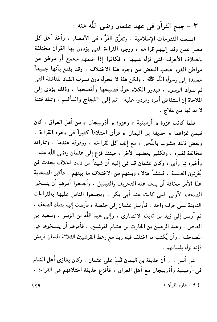 عن أنس: "أن حذيفة بن اليمان قَدِمَ على عثمان، وكان يغازي أهل الشام في أرمينية وأذربيجان مع أهل العراق، فأفزع حذيفة اختلافهم في القراءة،