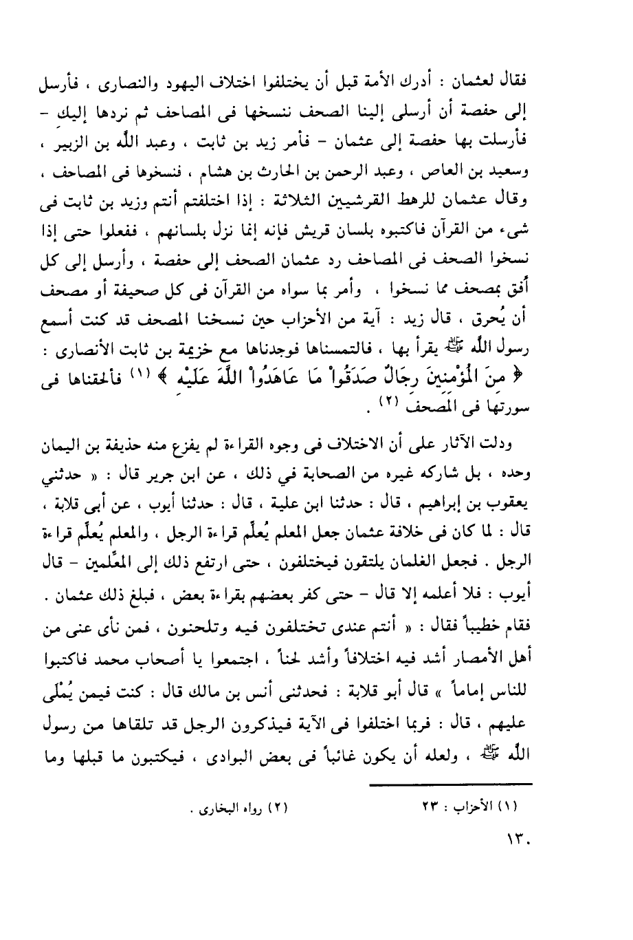 فقال لعثمان، أدرك الأمة قبل أن يختلفوا اختلاف اليهود والنصارى، فأرسل إلى حفصة أن أرسلي إلينا الصحف ننسخها في المصاحف ثم نردها إليكِ، فأرسلت بها حفصة إلى عثمان، فأمر زيد بن ثابت، وعبد الله بن الزبير، وسعيد بن العاص، وعبد الرحمن بن الحارث بن هشام، فنسخوها في المصاحف، وقال عثمان للرهط القرشيين الثلاثة: إذا اختلفتم أنتم وزيد بن ثابت في شيء من القرآن فاكتبوه بلسان قريش فإنه إنما نزل بلسانهم، ففعلوا حتى إذا نسخوا الصحف في المصاحف رد عثمان الصحف إلى حفصة، وأرسل إلى كل أفق بمصحف مما نسخوا، وأمر بما سواه من القرآن في كل صحيفة أو مصحف أن يُحرق، قال زيد: آية من الأحزاب حين نسخنا المصحف قد كنت أسمع رسول الله -صلى الله عليه وسلم- يقرأ بها، فالتمسناها فوجدناها مع خزيمة بن ثابت الأنصاري: {مِنَ الْمُؤْمِنِينَ رِجَالٌ صَدَقُوا مَا عَاهَدُوا اللَّهَ عَلَيْهِ} 1, فألحقناها في سورتها في المصحف2.