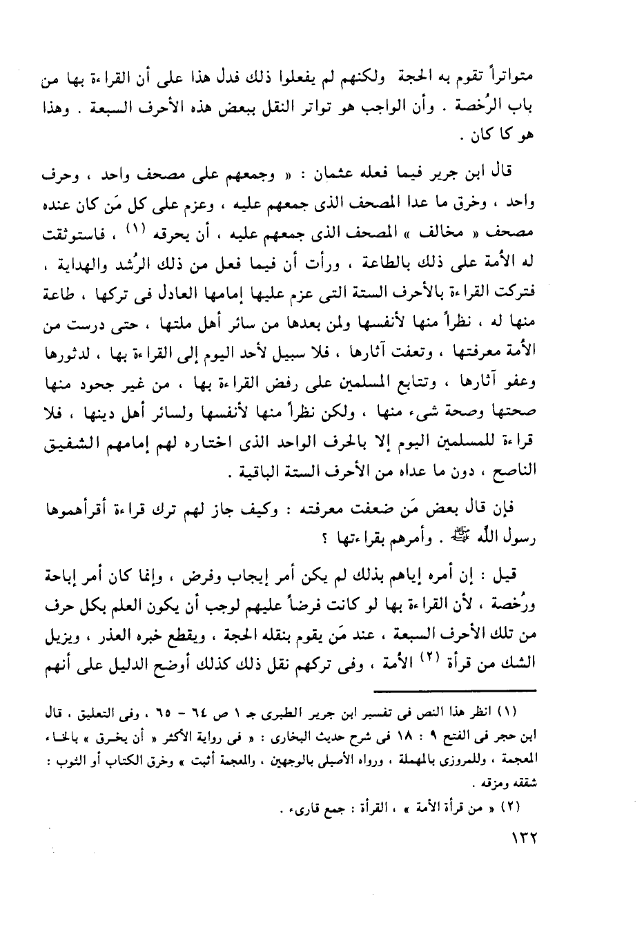 متواترًا تقوم به الحجة ولكنهم لم يفعلوا ذلك فدل هذا على أن القراءة بها من باب الرخصة. وأن الواجب هو تواتر النقل ببعض هذه الأحرف السبعة. وهذا هو ما كان.