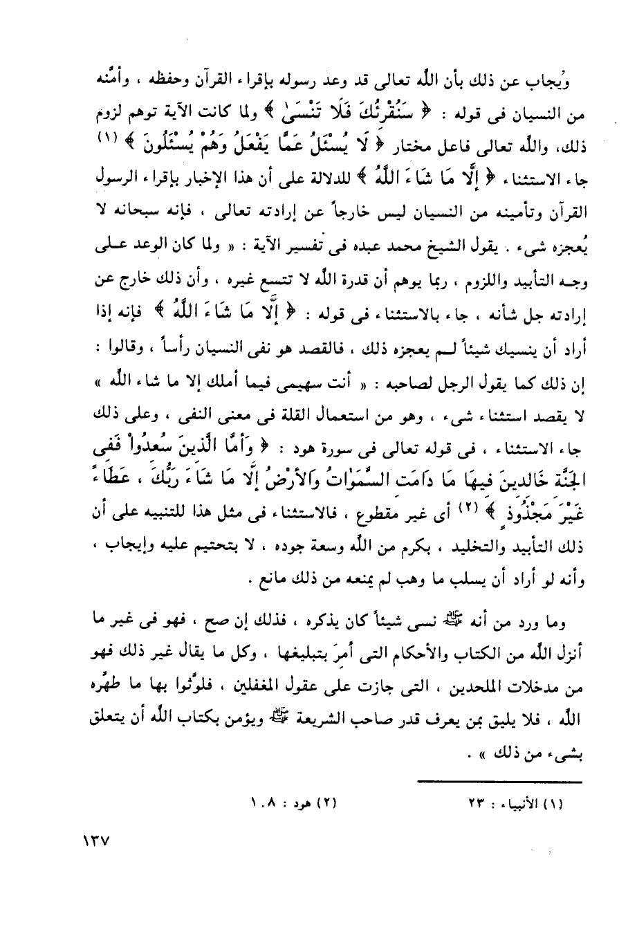 ويُجاب عن ذلك بأن الله تعالى قد وعد رسوله بإقراء القرآن وحفظه، وأمَّنه من النسيان في قوله: {سَنُقْرِئُكَ فَلا تَنْسَى} ولما كانت الآية توهم لزوم ذلك، والله تعالى فاعل مختار: {لا يُسْأَلُ عَمَّا يَفْعَلُ وَهُمْ يُسْأَلُونَ} 1, جاء الاستثناء {إِلَّا مَا شَاءَ اللَّهُ} للدلالة على أن هذا الإخبار بإقراء الرسول القرآن وتأمينه من النسيان ليس خارجًا عن إرادته تعالى، فإنه سبحانه لا يعجزه شيء، يقول الشيخ محمد عبده في تفسير الآية: "ولما كان الوعد على وجه التأبيد واللزوم، ربما يوهم أن قدرة الله لا تتسع غيره، وأن ذلك خارج عن إرادته جل شأنه، جاء بالاستثناء في قوله: {إِلَّا مَا شَاءَ اللَّهُ} فإنه إذا أراد أن ينسيك شيئًا لم يعجزه ذلك، فالقصد هو نفي النسيان رأسًا، وقالوا: إن ذلك كما يقول الرجل لصاحبه: "أنت سهيمي فيما أملك إلا ما شاء الله" لا يقصد استثناء شيء، وهو من استعمال القلة في معنى النفي، وعلى ذلك جاء الاستثناء، في قوله تعالى في سورة هود: {وَأَمَّا الَّذِينَ سُعِدُوا فَفِي الْجَنَّةِ خَالِدِينَ فِيهَا مَا دَامَتِ السَّمَاوَاتُ وَالْأَرْضُ إِلَّا مَا شَاءَ رَبُّكَ عَطَاءً غَيْرَ مَجْذُوذٍ} 2, أي غير مقطوع، فالاستثناء في مثل هذا للتنبيه على أن ذلك التأبيد والتخليد، بكرم من الله وسعة جوده، لا بتحتيم عليه وإيجاب، وأنه لو أراد أن يسلب ما وهب لم يمنعه من ذلك مانع.